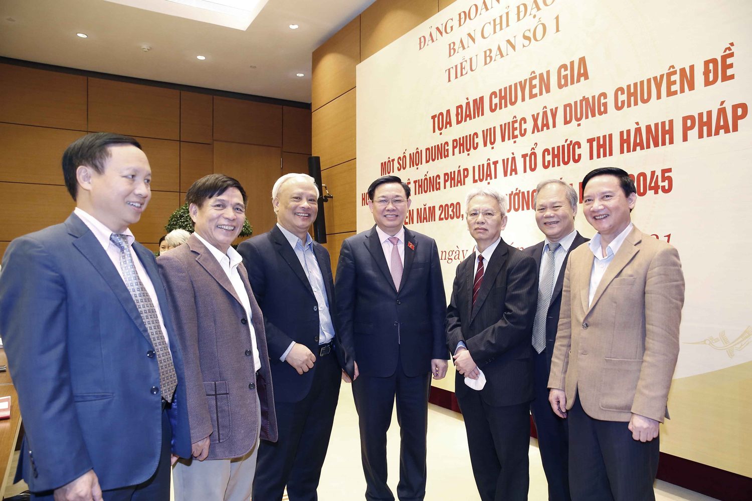 Ủy viên Bộ Chính trị, Chủ tịch Quốc hội Vương Đình Huệ với các đại biểu tham dự Tọa đàm chuyên gia một số nội dung phục vụ việc xây dựng chuyên đề hoàn thiện hệ thống pháp luật và tổ chức thi hành pháp luật đến năm 2030, định hướng đến năm 2045, tại nhà Quốc hội_Ảnh: Tư liệu