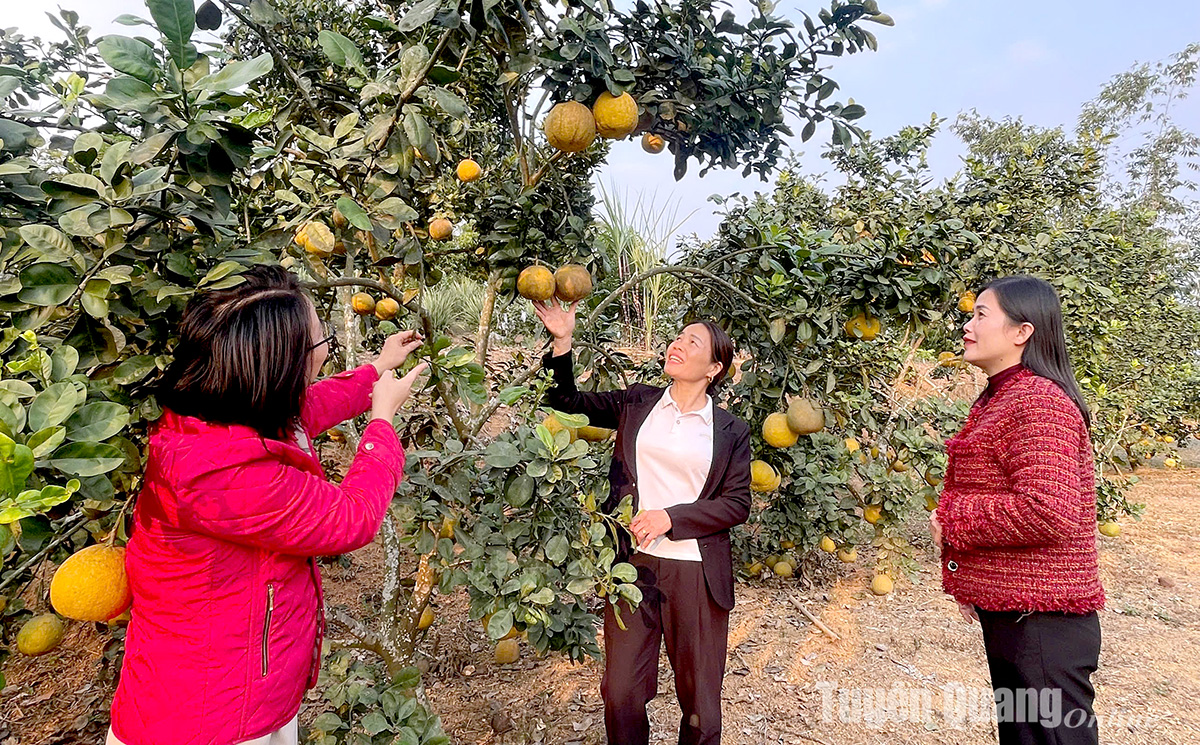 Chị Trương Thị Đài (giữa), Phó Bí thư Chi bộ thôn Tông Trang, xã Vinh Quang giới thiệu mô hình cây ăn quả của gia đình.