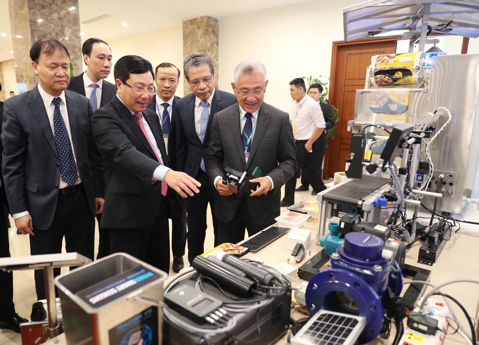 Ủy viên Bộ Chính trị, Phó Thủ tướng Chính phủ, Bộ trưởng Bộ Ngoại giao Phạm Bình Minh và các đại biểu tham quan trưng bày sản phẩm của các doanh nghiệp là người Việt Nam ở nước ngoài đang đầu tư tại Việt Nam bên lề Hội nghị sơ kết 5 năm thực hiện Chỉ thị số 45-CT/TW về công tác đối với người Việt Nam ở nước ngoài trong tình hình mới, tháng 11-2020 _Ảnh: TTXVN