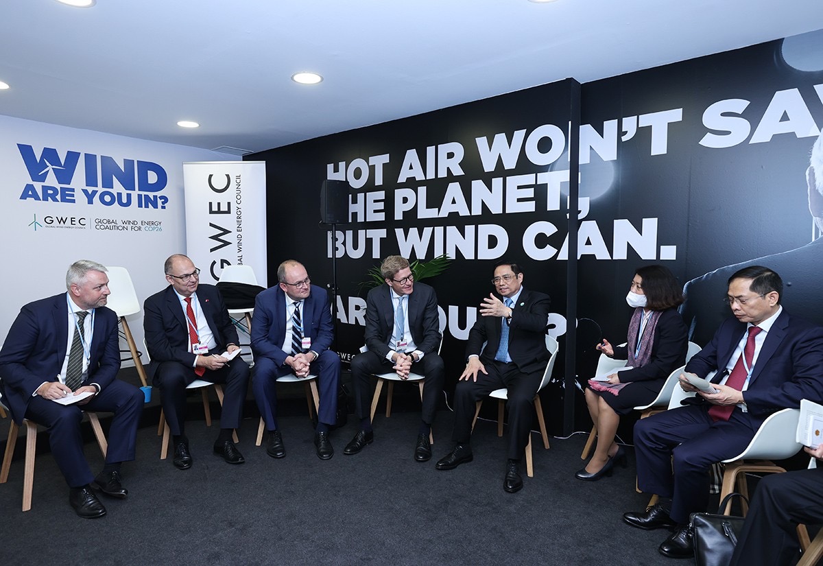 Ủy viên Bộ Chính trị, Thủ tướng Chính phủ Phạm Minh Chính tiếp Hội đồng Năng lượng gió toàn cầu (GWEC) tại Hội nghị lần thứ 26 các bên tham gia Công ước khung của Liên hợp quốc về Biến đổi khí hậu (COP26)_Ảnh: TTXVN