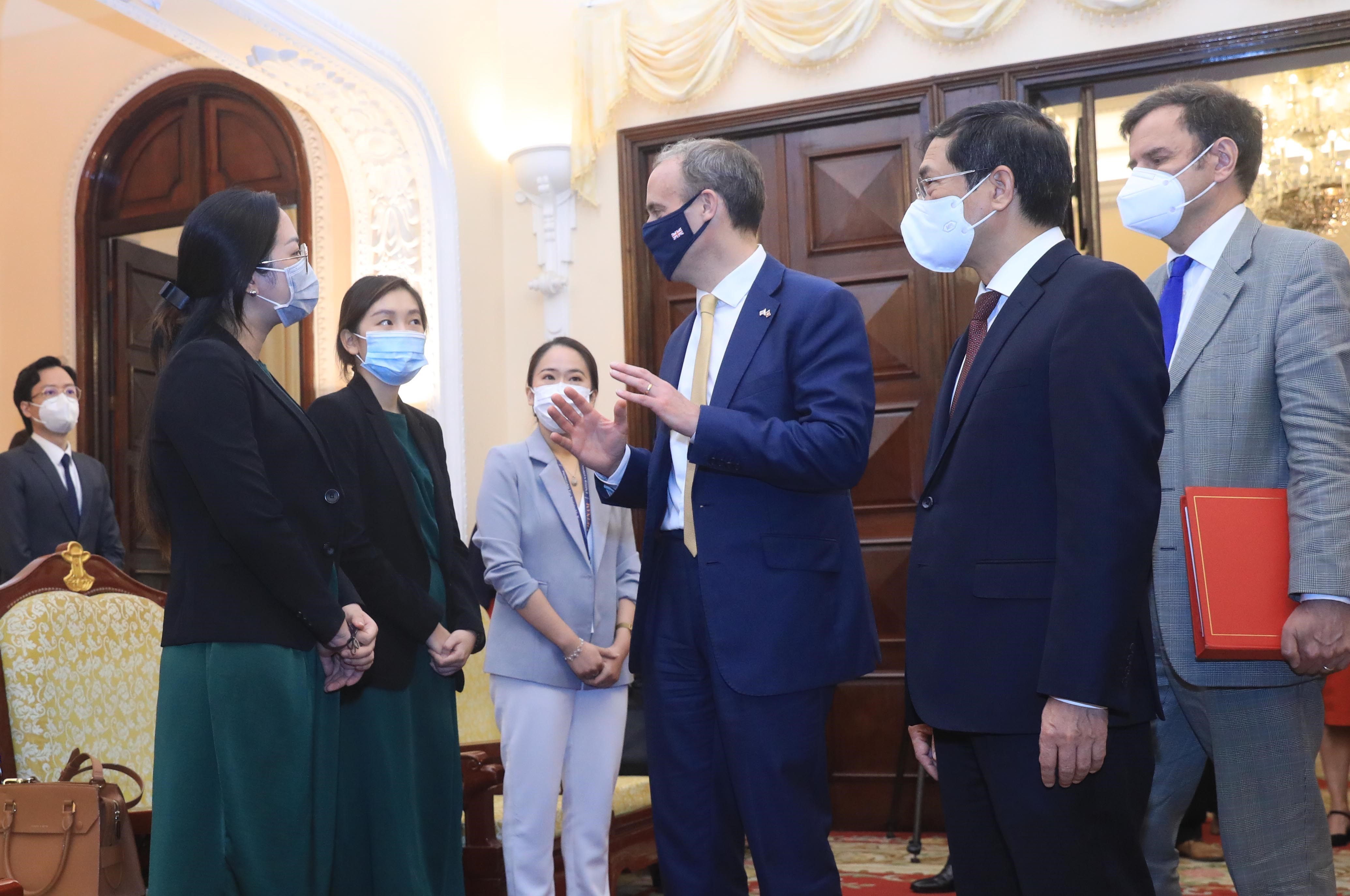 Ủy viên Trung ương Đảng, Bộ trưởng Bộ Ngoại giao Bùi Thanh Sơn và Bộ trưởng Bộ Ngoại giao và Phát triển Liên hiệp Vương quốc Anh và Bắc Ireland Dominic Raab với các công dân nhận học bổng Chevening của Chính phủ Anh_Ảnh: TTXVN