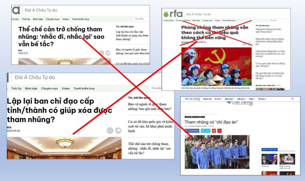 Chúng đưa ra các nhận định, luận điệu, kết luận hết sức trắng trợn: “Chống tham nhũng thực chất để thanh trừng lẫn nhau”, “Chỉ tự do chính trị mới giúp Việt Nam chống được tham nhũng”, “Chống tham nhũng biến thành thanh trừng chính trị”, “Có ai còn tin câu: Chống tham nhũng ở Việt Nam không có vùng cấm?”. Chúng cho rằng, đấu tranh PCTN ở Việt Nam chỉ là sự “đấu đá” vì “lợi ích nhóm”, “thanh trừng nội bộ, triệt tiêu phe cánh”. Dù các vụ việc được xét xử công khai và thông tin rộng rãi trên các phương tiện thông tin đại chúng nhưng các thế lực thù địch vẫn cố tình cắt xén, nhào nặn rồi dựng nên câu chuyện về các “phe nhóm nội bộ”, các “nhóm lợi ích” hay phe cánh đang đấu đá lẫn nhau. Chúng triệt để khai thác đời tư cán bộ, thêu dệt, gán ghép, cắt ghép ảnh chụp những ngôi biệt thự, những siêu xe sang trọng và lấy đó làm “chứng cứ” quy chụp, bịa đặt tài sản tham nhũng của cán bộ các cấp...