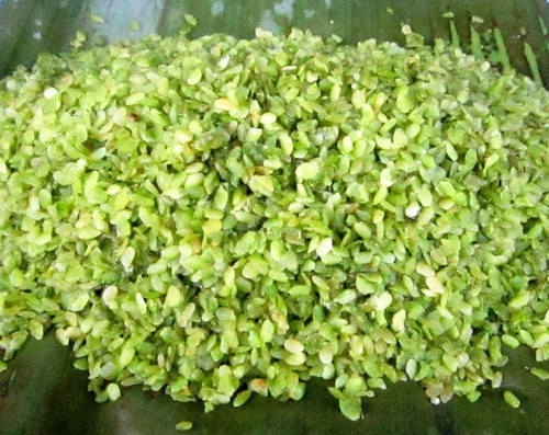 Một mẻ cốm làm ra có hạt dẹt, màu xanh và có mùi thơm, béo ngậy của lúa non. Lúc này, các bà, các chị sẽ rải một lớp lá chuối vào thúng, cho cốm vào buộc thành những gói nhỏ để giữ mùi thơm.