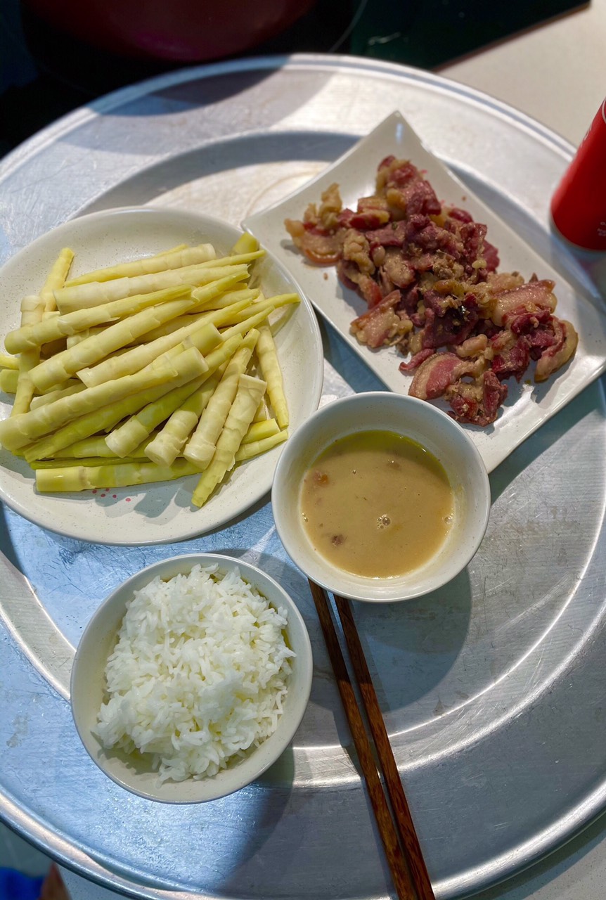 Măng sặt luộc cũng rất độc đáo. Măng luộc mềm, hết vị hăng được chấm cùng bát mẻ đậm vị chua chua càng trở nên thanh mát.