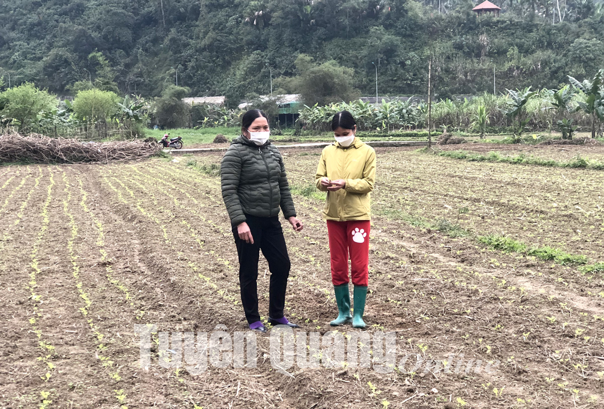 Đồng chí Nguyễn Thị Bích (bên trái), Bí thư chi bộ tổ dân phố Nà Khà, thị trấn Lăng Can (Lâm Bình) thăm vườn lạc