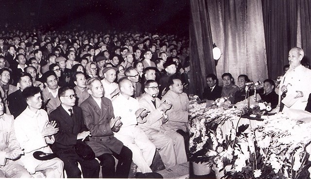 Chủ tịch Hồ Chí Minh nói chuyện với cán bộ, đảng viên tại Lễ kỷ niệm lần thứ 35 ngày thành lập Đảng 03/02/1965. (Ảnh tư liệu).
