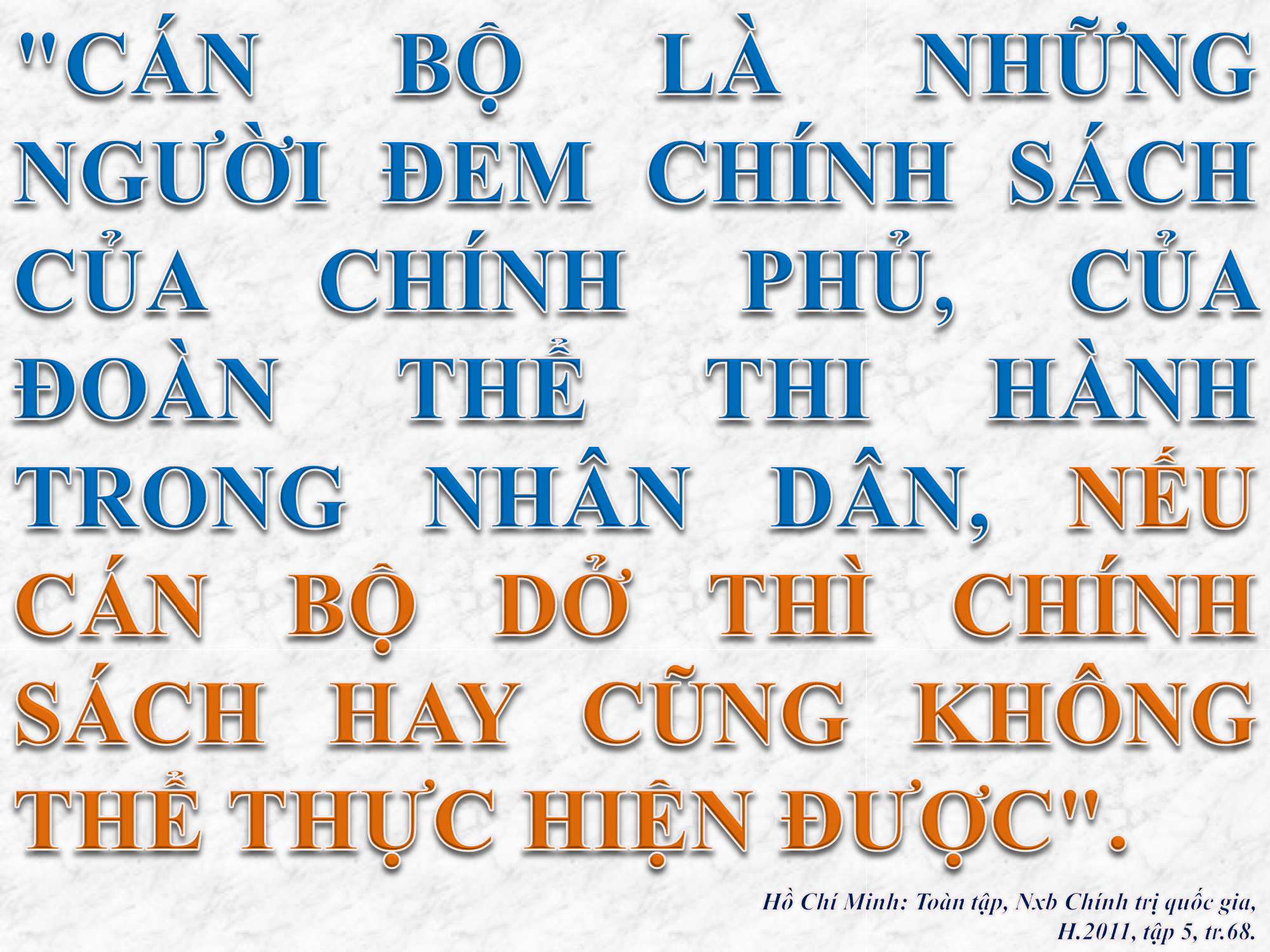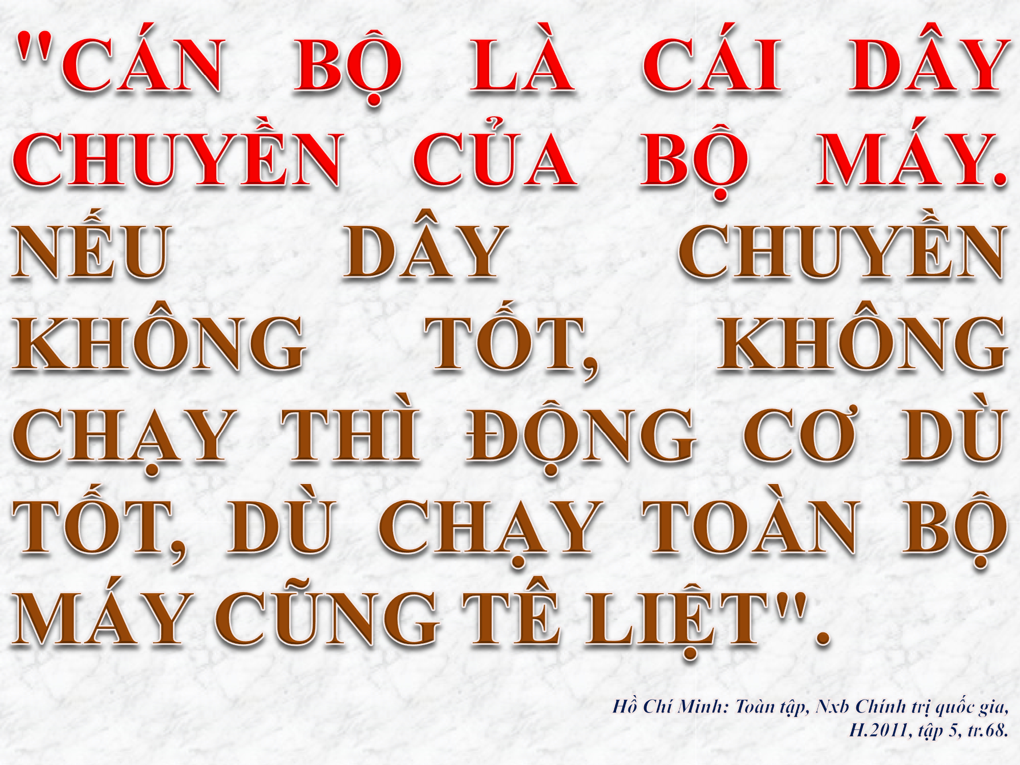 Sinh thời, Chủ tịch Hồ Chí Minh - người sáng lập và rèn luyện Đảng Cộng sản Việt Nam từng nhiều lần khẳng định: “Muôn việc thành công hoặc thất bại, đều do cán bộ tốt hoặc kém”. Ngày 20 tháng 2 năm 1947, trong bài nói chuyện với cán bộ tỉnh Thanh Hóa, Người cho rằng: Cán bộ còn là cầu nối, là dây chuyền của bộ máy, phải thực sự tận tâm, tận lực với công việc, thực sự là tấm gương trước quần chúng nhân dân, thực sự là công bộc của dân. Bác nhấn mạnh: “Cán bộ là cái dây chuyền của bộ máy. Nếu dây chuyền không tốt, không chạy thì động cơ dù tốt, dù chạy toàn bộ máy cũng tê liệt... Đoàn thể mình mạnh hay yếu là ở dân. Dân nghe theo là mình mạnh. Hiểu nguyện vọng của dân, sự cực khổ của dân. Hiểu tâm lý của dân, học sáng kiến của dân... Phải tôn kính dân, phải làm cho dân tin, phải làm gương cho dân. Muốn cho dân phục phải được dân tin, muốn cho dân tin phải thanh khiết...”.