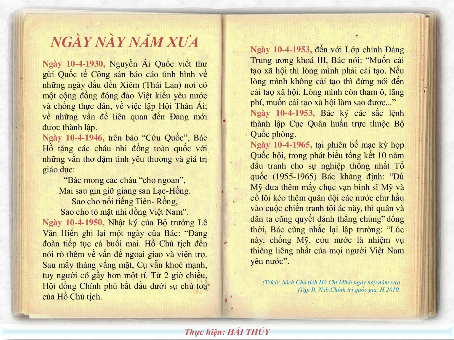 Ngày 10 tháng 4 năm 1954, Chủ tịch Hồ Chí Minh với bút danh "C.B." có bài viết "Nhiệm vụ của các chi bộ ở cơ quan" đăng trên Báo Nhân Dân, số 176, trong đó, nêu nhiệm vụ phải phát huy vai trò "Chi bộ phải là động lực của mỗi cơ quan" để đẩy mạnh kháng chiến và cải cách ruộng đất thắng lợi, Người chỉ rõ: