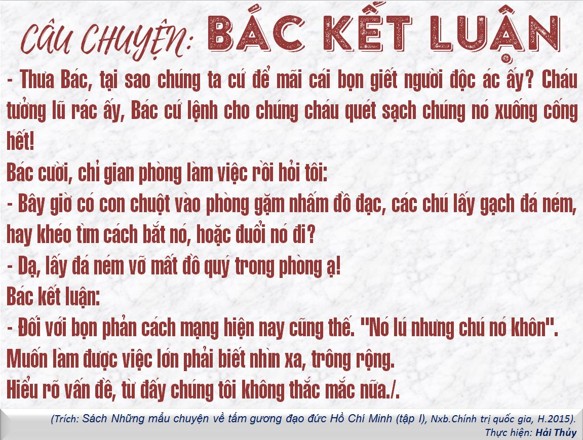 Trong các bài báo về chi bộ, Chủ tịch Hồ Chí Minh đều khẳng định rõ nhân dân ta rất tốt, nếu chi bộ khéo lãnh đạo và đảng viên hăng hái xung phong làm gương thì khó khăn gì cũng vượt qua, công việc gì cũng làm tốt.