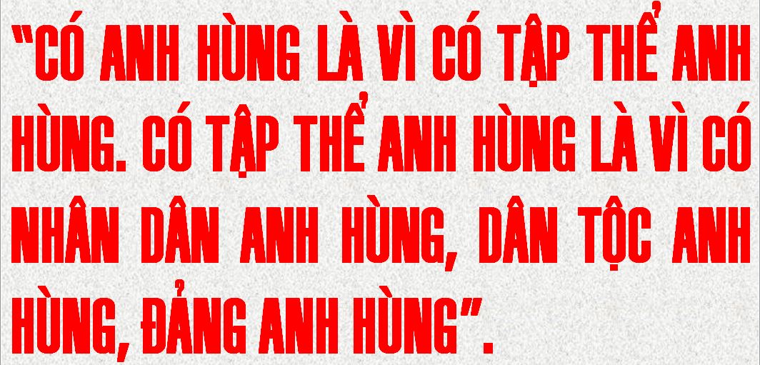 Người khẳng định: "Các cô, các chú được tuyên dương là anh hùng phải nhận rõ rằng vinh dự đó là vinh dự chung của tập thể, chứ không chỉ là của riêng từng người. Nếu không có Đảng, không có nhân dân, không có tập thể thì mọi người không trở thành anh hùng được. Có anh hùng là vì có tập thể anh hùng. Có tập thể anh hùng là vì có nhân dân anh hùng, dân tộc anh hùng, Đảng anh hùng. Sự nghiệp anh hùng của nhân dân ta gắn liền với sự nghiệp đấu tranh cách mạng của nhân dân thế giới. Vì vậy, các anh hùng và các đơn vị anh hùng phải luôn luôn khiêm tốn, không được kiêu ngạo". (Hồ Chí Minh, Toàn tập, Nhà xuất bản Chính trị quốc gia - Sự thật, Hà Nội 2011, t.15, tr.263).