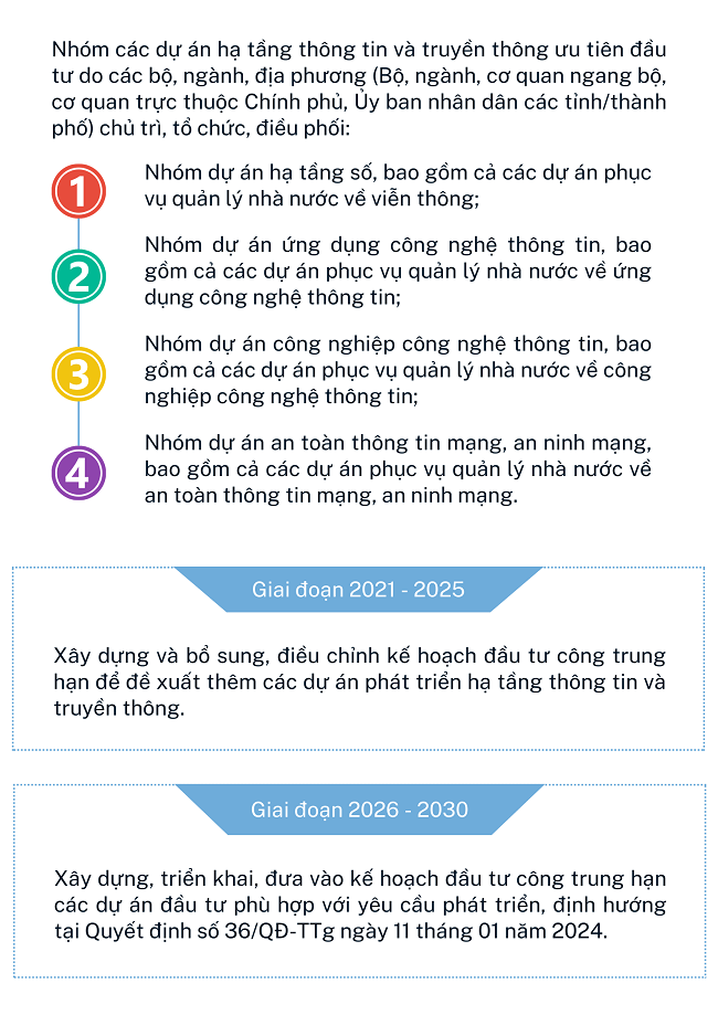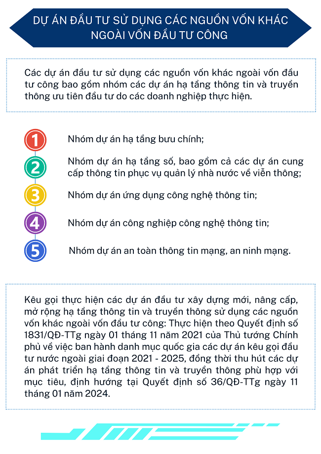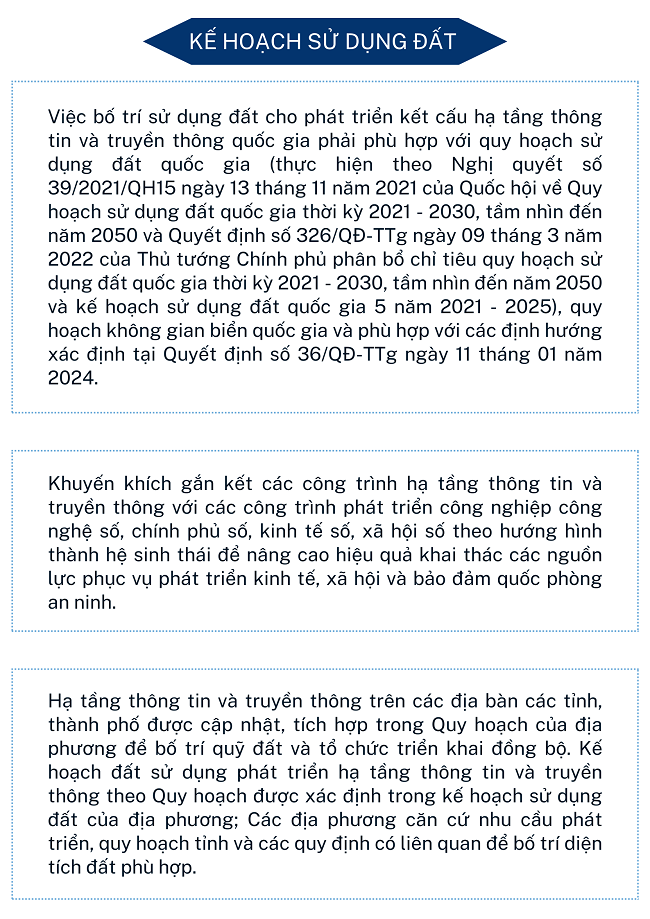 Ngày 07/8/2024, Thủ tướng Chính phủ ban hành Quyết định số 805/QĐ-TTg về Phê duyệt kế hoạch thực hiện quy hoạch hạ tầng thông tin và truyền thông thời kỳ 2021 - 2030, tầm nhìn đến năm 2050; trong đó, dự án đầu tư công, dự án đầu tư sử dụng các nguồn vốn khác ngoài vốn đầu tư công và kế hoạch sử dụng đất như sau: