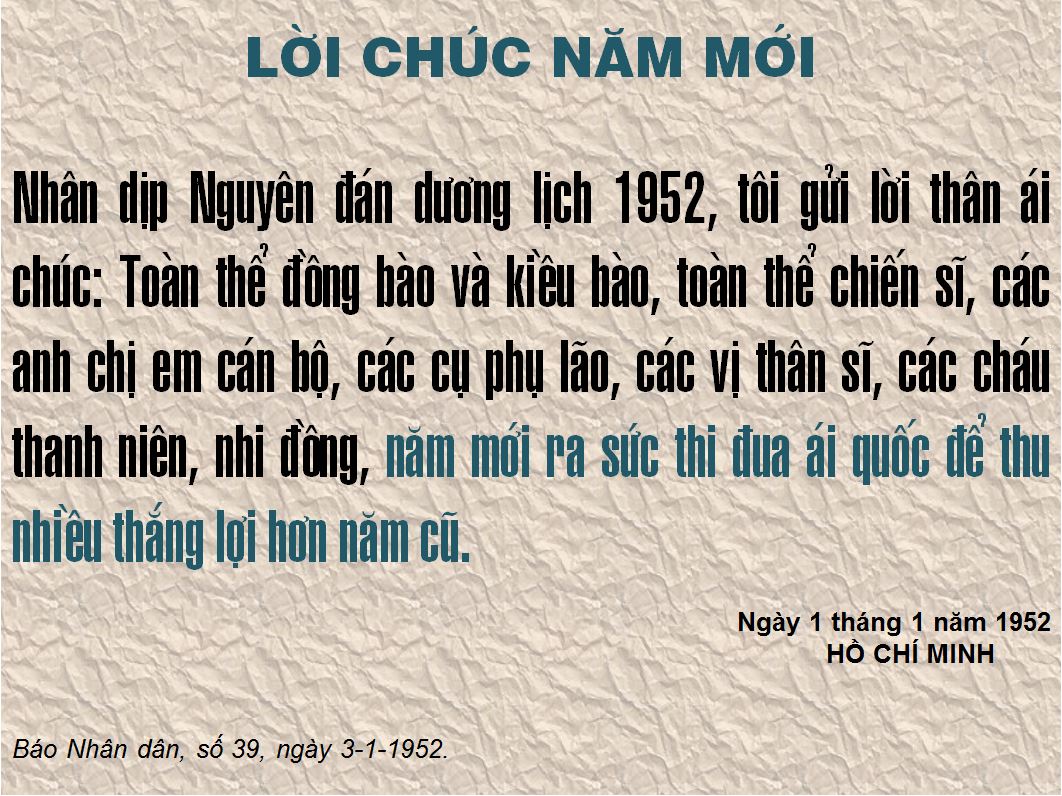 Trong bối cảnh nhân dân cả nước, dưới sự lãnh đạo của Đảng đã trải qua gần 7 năm tiến hành cuộc kháng chiến chống thực dân Pháp xâm lược, giải phóng dân tộc; ngày 1 tháng 1 năm 1952, Bác viết thư "Lời chúc năm mới" đăng trên Báo Nhân dân ngày 03-1-1952.