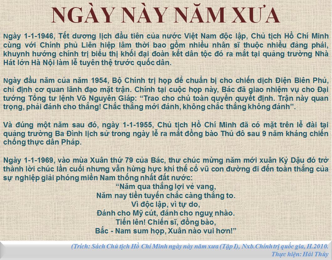 Sinh thời, hằng năm Bác Hồ đều có thư thiếp chúc mừng năm mới toàn Đảng, toàn dân biểu dương thành tích năm cũ và chỉ ra nhiệm vụ chiến lược năm mới.
