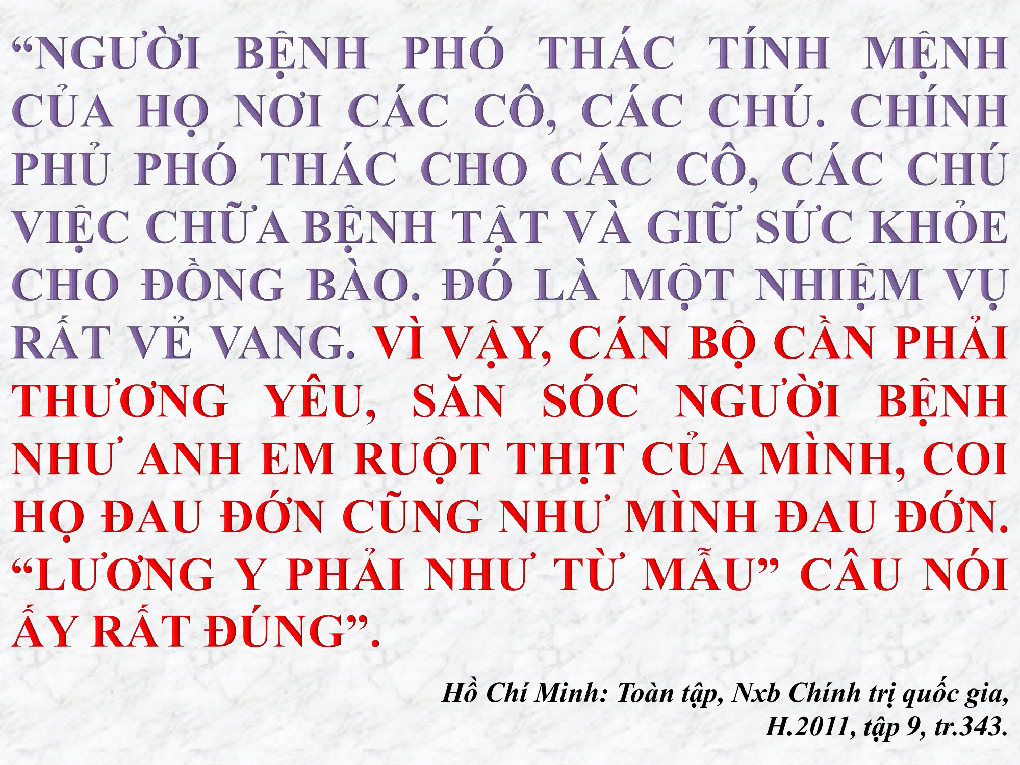 Thực hiện lời dạy của Người, những năm qua, đội ngũ cán bộ y tế đã không ngừng học tập, nâng cao trình độ chuyên môn, tâm huyết với nghề nghiệp, thấu hiểu tâm lý bệnh nhân và người nhà bệnh nhân, luôn có lòng nhân ái, yêu thương người bệnh, thường xuyên tu dưỡng, rèn luyện y đức, góp phần chăm sóc tốt sức khỏe cho người bệnh. Ngành Y tế đã đề ra nhiều chủ trương, biện pháp xây dựng hình ảnh người cán bộ, công chức có tinh thần trách nhiệm, có năng lực công tác, hết lòng vì bệnh nhân.