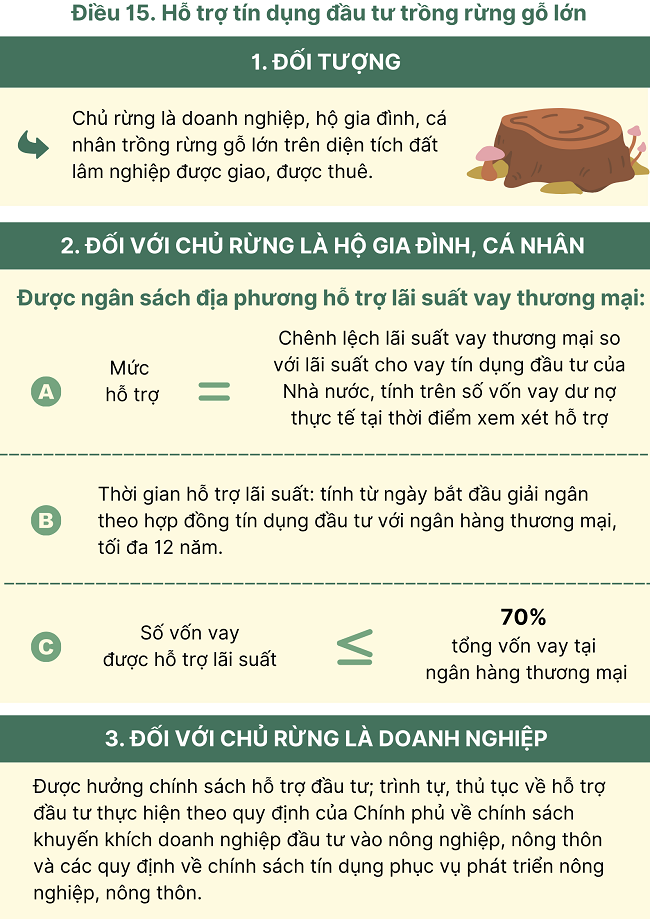 Ngày 24/5/2024, Chính phủ ban hành Nghị định số 58/2024/NĐ-CP về một số chính sách đầu tư trong lâm nghiệp, với một số chính sách về bảo vệ và phát triển rừng, chế biến lâm sản đối với rừng sản xuất quy định tại điều 12, 14, 15 như sau: