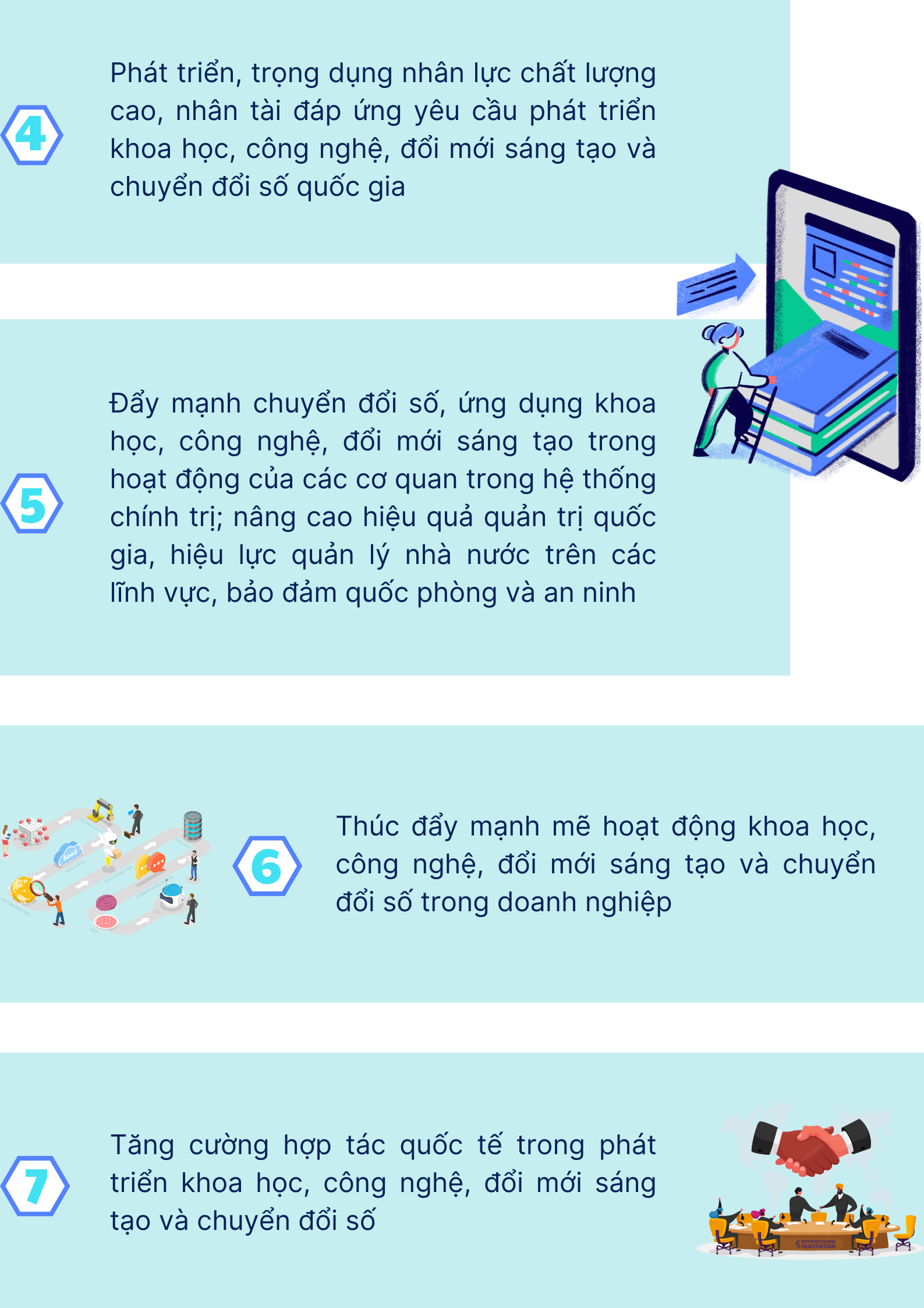 Ngày 22/12/2024, Ban Chấp hành Trung ương ban hành Nghị quyết số 57-NQ/TW về đột phá phát triển khoa học, công nghệ, đổi mới sáng tạo và chuyển đổi số, với một số nhiệm vụ, giải pháp như sau: