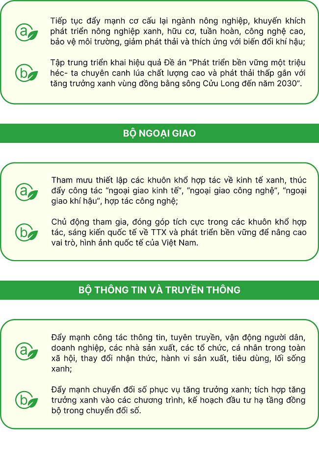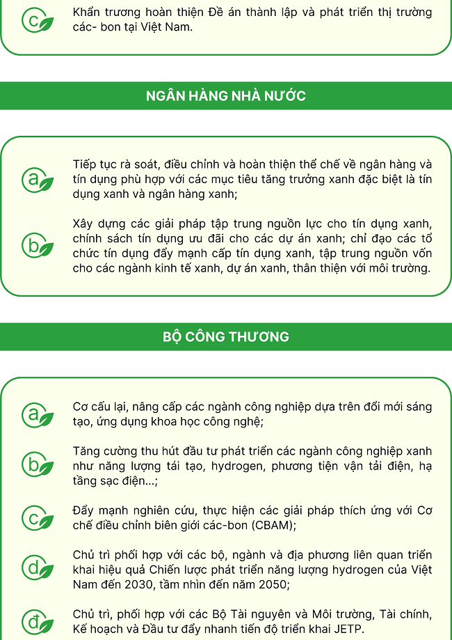 Ngày 09/12/2024 Thủ tướng Chính phủ ban hành Chỉ thị 44/CT-TTg triển khai một số nhiệm vụ, giải pháp trọng tâm nhằm đẩy mạnh thực hiện Chiến lược quốc gia về tăng trưởng xanh giai đoạn 2021 - 2030, tầm nhìn 2050 như sau: