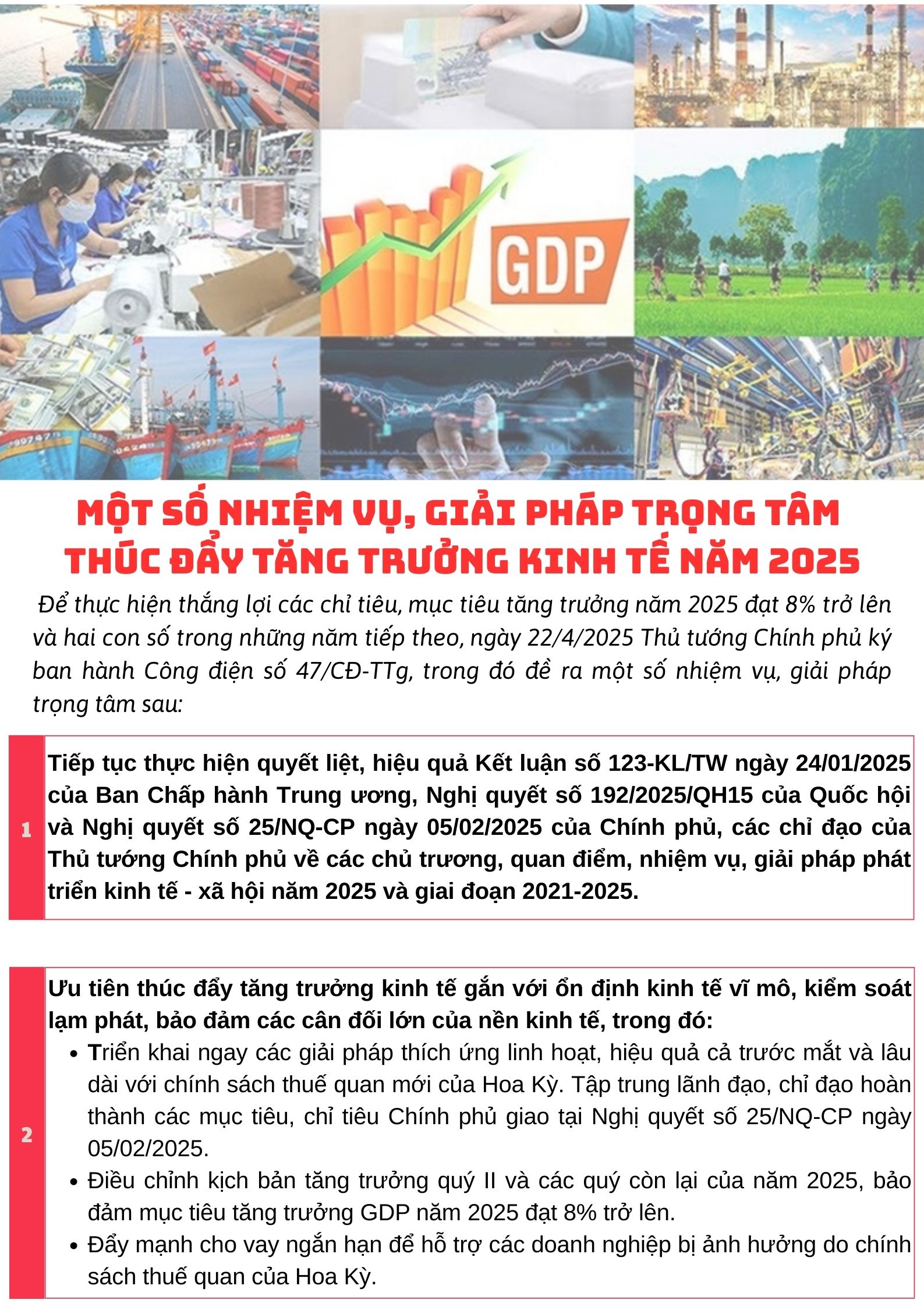 Theo Công điện số 47/CĐ-TTg ngày 22/4/2025 của Thủ tướng Chính phủ về một số nhiệm vụ. giải pháp trọng tâm thúc đẩy tăng trưởng kinh tế năm 2025