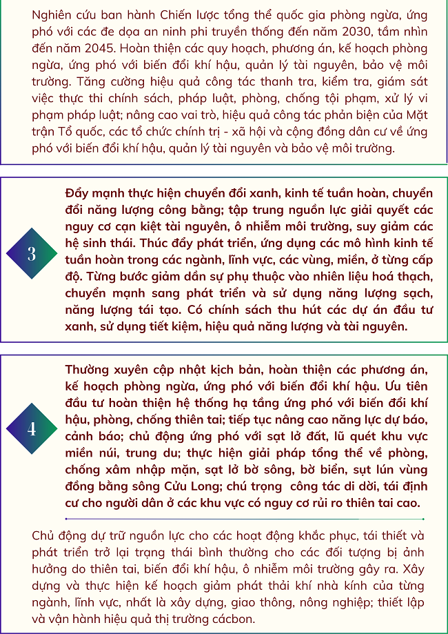 Ngày 04/6/2024 Bộ Chính trị ban hành Kết luận số 81-KL/TW về tiếp tục thực hiện Nghị quyết Trung ương 7 khóa XI về chủ động ứng phó với biến đổi khí hậu, tăng cường quản lý tài nguyên và bảo vệ môi trường, với một số nhiệm vụ và giải pháp trọng tâm sau: