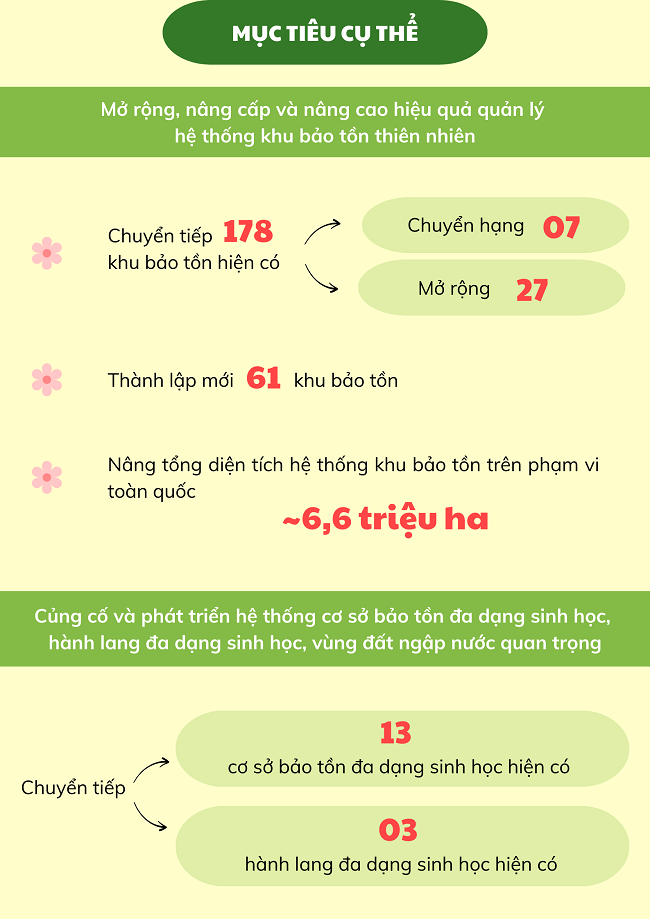 Ngày 08/11/2024, Thủ tướng Chính phủ ban hành Quyết định số 1352/QĐ-TTg phê duyệt quy hoạch bảo tồn đa dạng sinh học quốc gia thời kỳ 2021 - 2030, tầm nhìn đến năm 2050 với mục tiêu như sau: