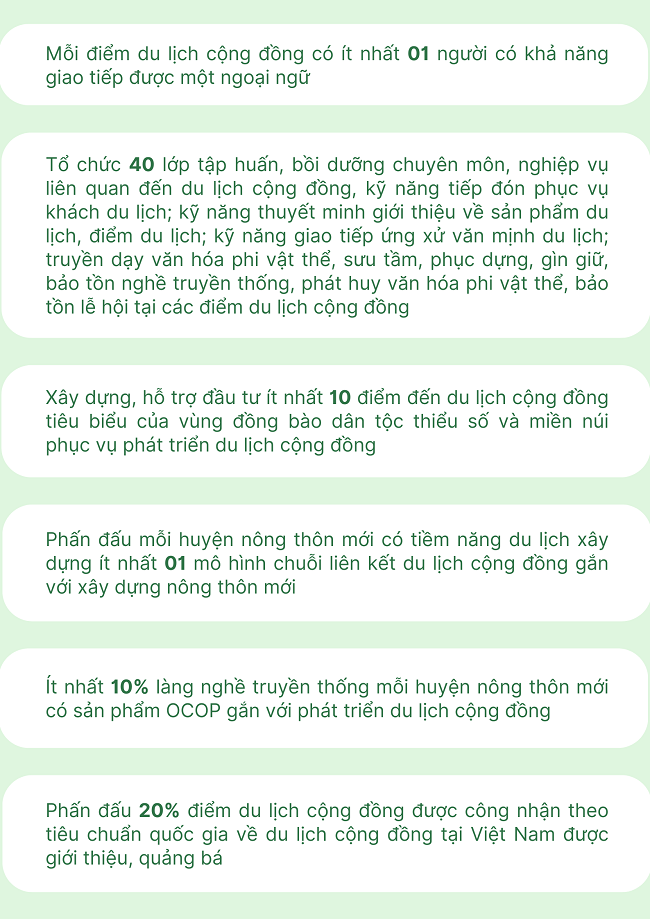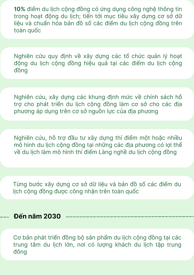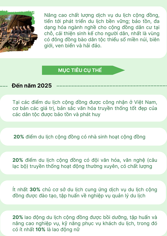 Ngày 30/10/2024, Bộ Văn hóa Thể thao và Du lịch ban hành Quyết định số 3222/QĐ-BVHTTDL về phê duyệt Đề án phát triển du lịch cộng đồng tại Việt Nam với mục tiêu như sau: