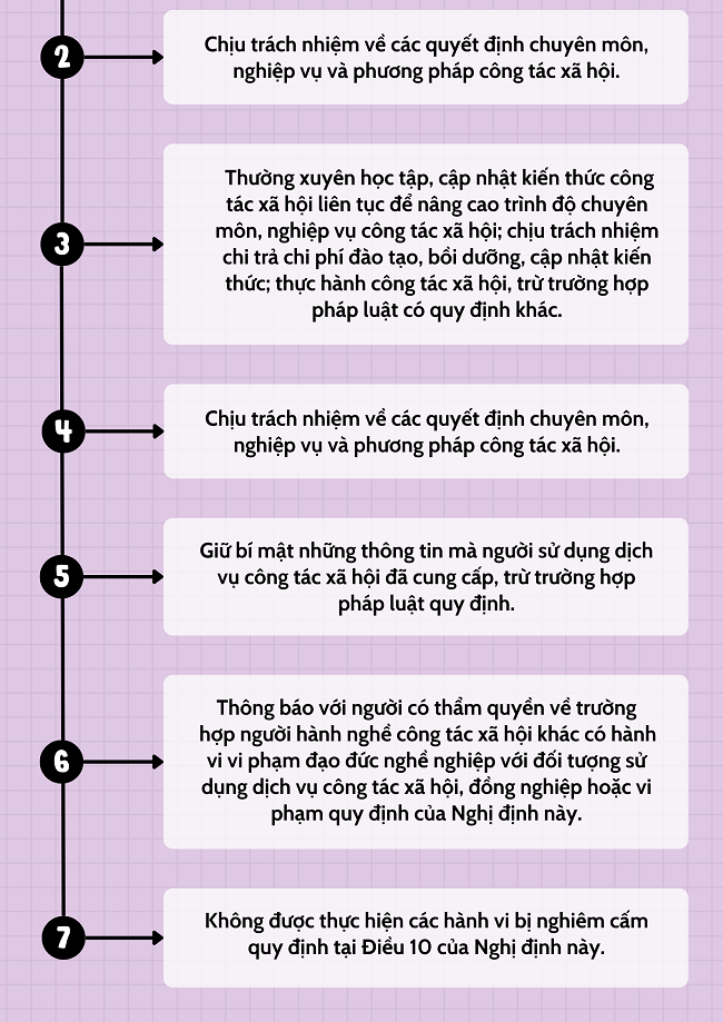 Ngày 30/8/2024 Chính phủ ban hành Nghị định số 110/2024/NĐ-CP về công tác xã hội với nghĩa vụ của người hành nghề công tác xã hội quy định tại điều 26, 27, 28, 29, 30 như sau:
