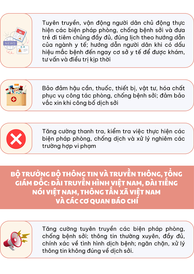 Ngày 14/11/2024, Thủ tướng Chính phủ ban hành Công điện 116/CĐ-TTg về việc tăng cường công tác phòng, chống bệnh sởi với nhiệm vụ, giải pháp như sau:
