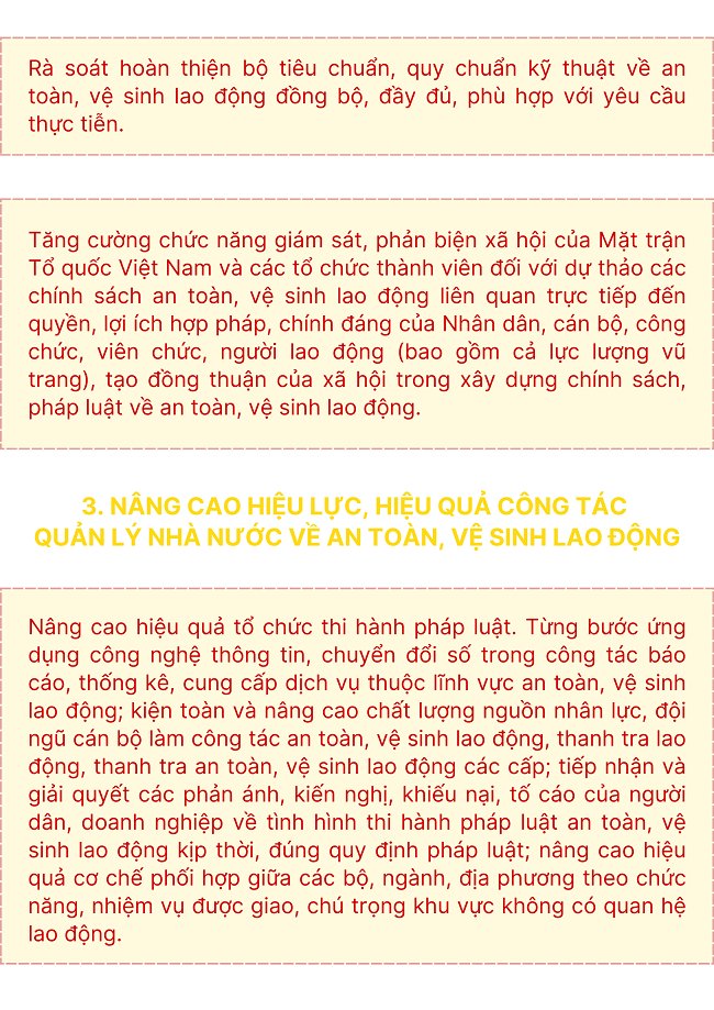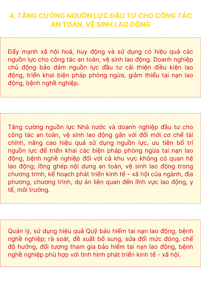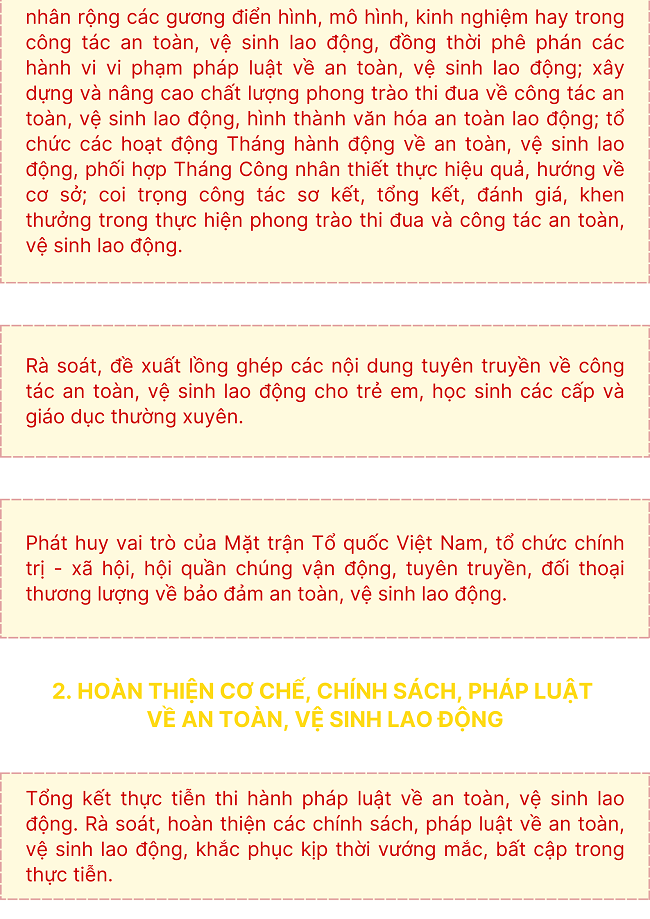 Ngày 28/10/2024, Chính phủ ban hành Nghị quyết số 209/NQ-CP về Kế hoạch thực hiện chỉ thị số 31-CT/TW ngày 19 tháng 3 năm 2024 của Ban Bí thư Trung ương Đảng khóa XIII về tiếp tục tăng cường sự lãnh đạo của Đảng đối với công tác an toàn, vệ sinh lao động trong tình hình mới với nhiệm vụ, giải pháp như sau: