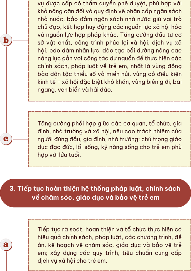 Ngày 14/10/2024, Thủ tướng Chính phủ ban hành Quyết định số 1183/QĐ-TTg về Kế hoạch triển khai thực hiện Chỉ thị số 28-CT/TW ngày 25 tháng 12 năm 2023 của Bộ Chính trị về tăng cường công tác chăm sóc, giáo dục và bảo vệ trẻ em đáp ứng yêu cầu phát triển đất nước phồn vinh, hạnh phúc với nhiệm vụ, giải pháp như sau: