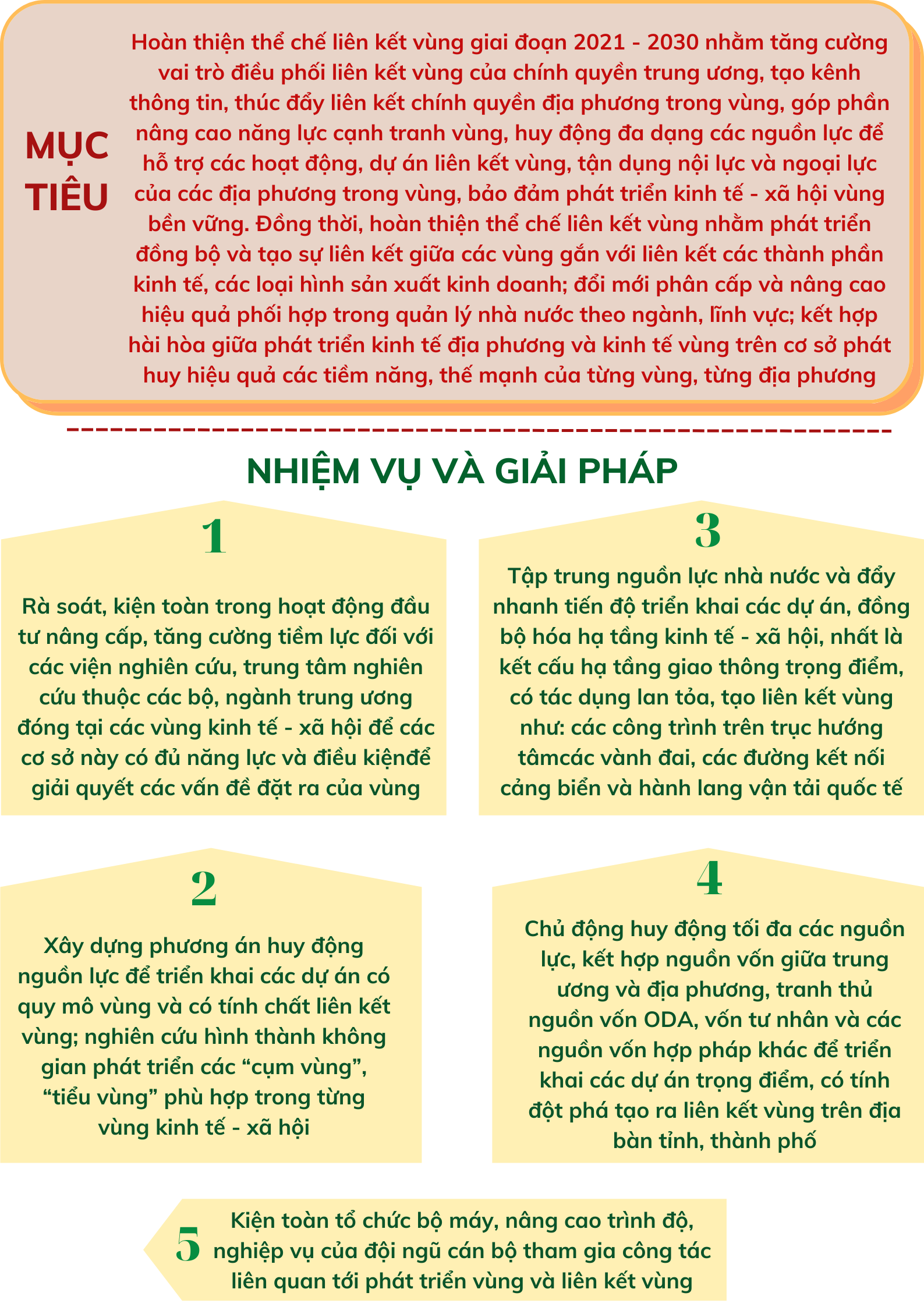 Ngày 21/4/2022, Chính phủ ban hành Nghị quyết số 57/NQ-CP về các nhiệm vụ, giải pháp hoàn thiện thể chế liên kết vùng kinh tế - xã hội với quan điểm, mục tiêu, nhiệm vụ và giải pháp như sau: