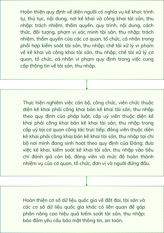 Ngày 04/12/2024, Bộ Chính trị ban hành Kết luận số 105-KL/TW về tiếp tục thực hiện Chỉ thị số 33-CT/TW, ngày 03/01/2014 của Bộ Chính trị về tăng cường sự lãnh đạo của Đảng đối với việc kê khai và kiểm soát việc kê khai tài sản trong thời gian tới, với một số nhiệm vụ sau: