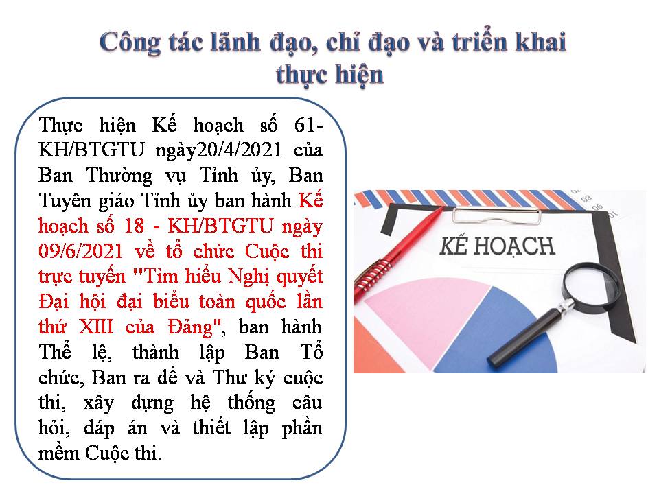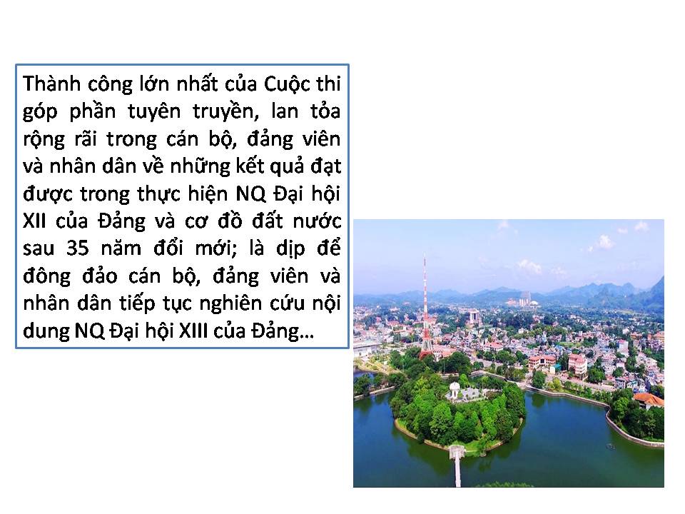 Đại hội XIII của Đảng thành công rất tốt đẹp, góp phần củng cố, nâng cao niềm tin của nhân dân đối với sự lãnh đạo của Đảng và sự nghiệp đổi mới của đất nước, cổ vũ toàn Đảng, toàn dân, toàn quân ta phát huy tinh thần yêu nước, ý chí và khát vọng phát triển đất nước. Nghị quyết Đại hội XIII của Đảng đã thực sự kết tinh trí tuệ của toàn Đảng, toàn dân, thể hiện rõ ý Đảng, lòng dân trong xây dựng và bảo vệ Tổ quốc. Để nhanh chóng đưa Nghị quyết Đại hội XIII của Đảng vào cuộc sống, Ban Tuyên giáo Tỉnh ủy Tuyên Quang đã có những việc làm cụ thể, thiết thực, trong đó, đã tổ chức thành công Cuộc thi trực tuyến "Tìm hiểu Nghị quyết Đại hội đại biểu toàn quốc lần thứ XIII của Đảng". Qua 01 tháng triển khai (từ 01/7/2021 đến ngày 30/7/2021), cuộc thi đã đạt được một số kết quả quan trọng, góp phần tuyên truyền tới cán bộ, đảng viên và Nhân dân về những kết quả đạt được trong thực hiện Nghị quyết Đại hội XII, cơ đồ đất nước sau 35 năm đổi mới, những nội dung cơ bản, cốt lõi về tầm nhìn, định hướng phát triển đất nước, các quan điểm chỉ đạo, mục tiêu chủ yếu, nhiệm vụ trọng tâm và đột phá chiến lược trong nhiệm kỳ Đại hội XIII của Đảng.