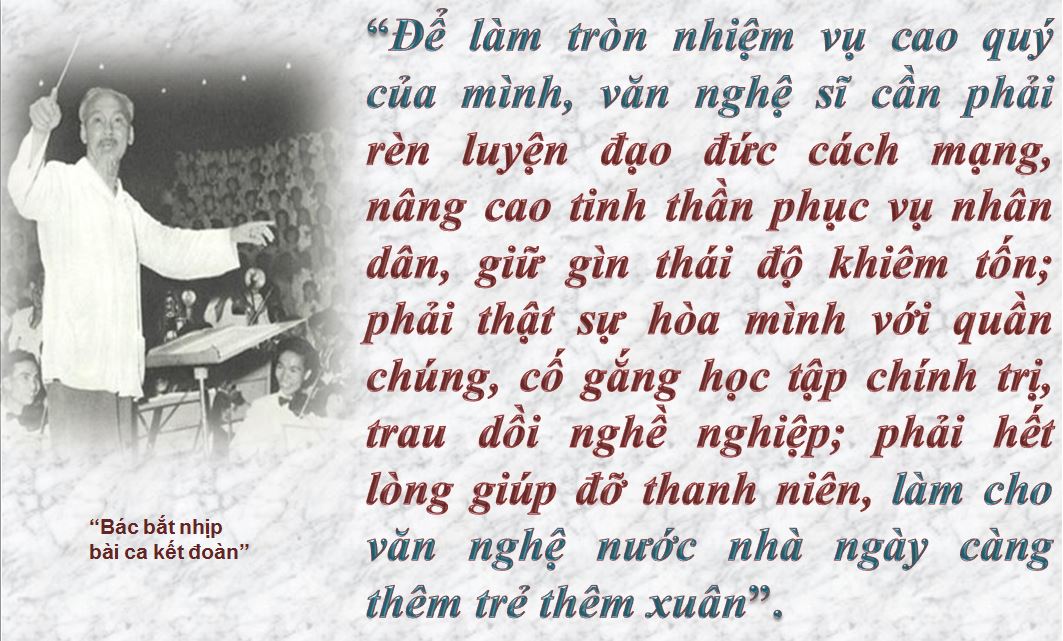 Là người đặt nền móng cho nền văn học nghệ thuật cách mạng, Chủ tịch Hồ Chí Minh thường xuyên sâu sát và chỉ bảo tận tình, trách nhiệm đối với đội ngũ những người làm công tác văn hóa văn nghệ. Ngày 1-12-1962, nói chuyện tại Đại hội Văn nghệ toàn quốc lần thứ III, Người nêu rõ: "Rõ ràng là dân tộc bị áp bức, thì văn nghệ cũng mất tự do. Văn nghệ muốn tự do thì phải tham gia cách mạng... Quần chúng đang chờ đợi những tác phẩm văn nghệ xứng đáng với thời đại vẻ vang của chúng ta, những tác phẩm ca tụng chân thật những người mới, việc mới chẳng những để làm gương mẫu cho chúng ta ngày nay, mà còn để giáo dục con cháu ta đời sau..".  Người căn dặn: