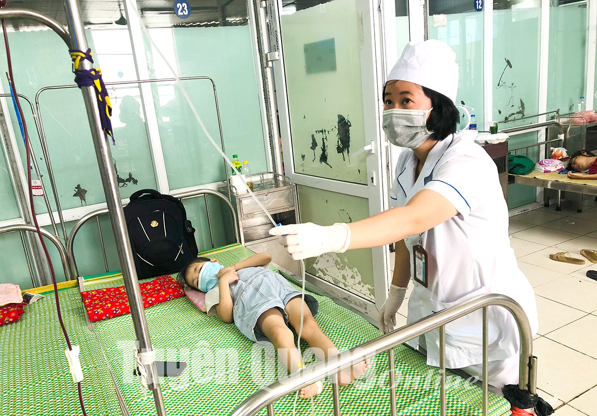 Chị Lý Thị Hằng, cán bộ điều dưỡng Khoa Nhi, Bệnh viện Đa khoa tỉnh bận rộn với công việc tại bệnh viện.