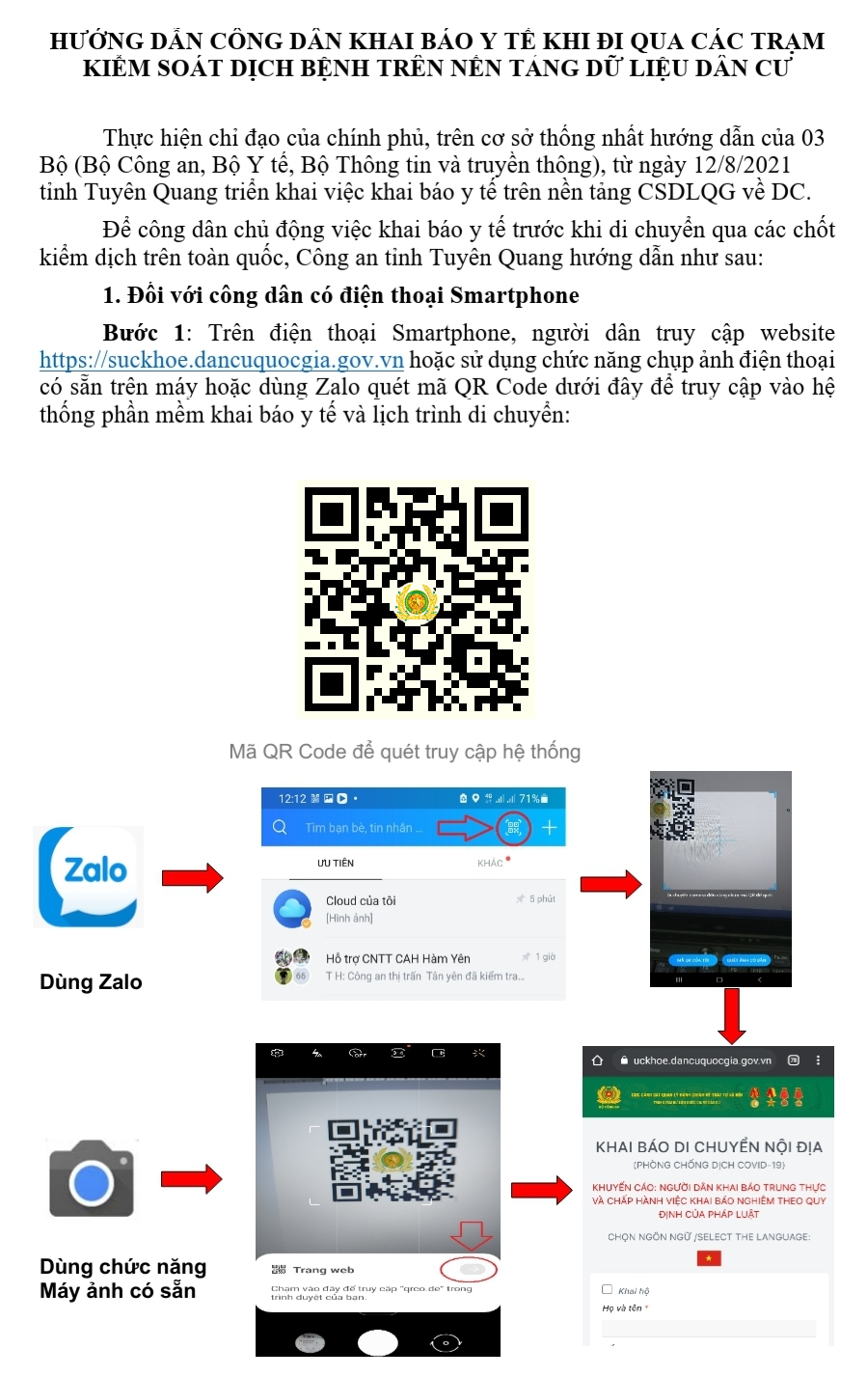 Để tạo điều kiện thuận lợi cho công dân khai báo y tế nhanh khi qua các chốt kiểm soát phòng, chống dịch Covid-19 và quản lý chặt chẽ công dân đi, về địa phương, phục vụ tốt cho công tác quản lý công dân, truy vết khi có yếu tố dịch tễ, Công an tỉnh, Sở Thông tin và Truyền thông hướng dẫn công dân khai báo qua ứng dụng phần mềm khai báo y tế trên nền tảng cơ sở dữ liệu dân cư.