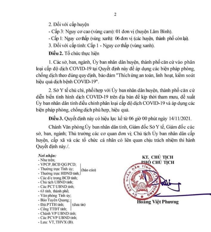 Trước diễn biến tình hình dịch Covid-19 trên địa bàn tỉnh, ngày 13/11/2021, Uỷ ban nhân dân tỉnh ban hành Quyết định số 1759/QĐ-UBND về việc quy định tạm thời phân loại cấp độ dịch Covid-19 trên địa bàn tỉnh Tuyên Quang.