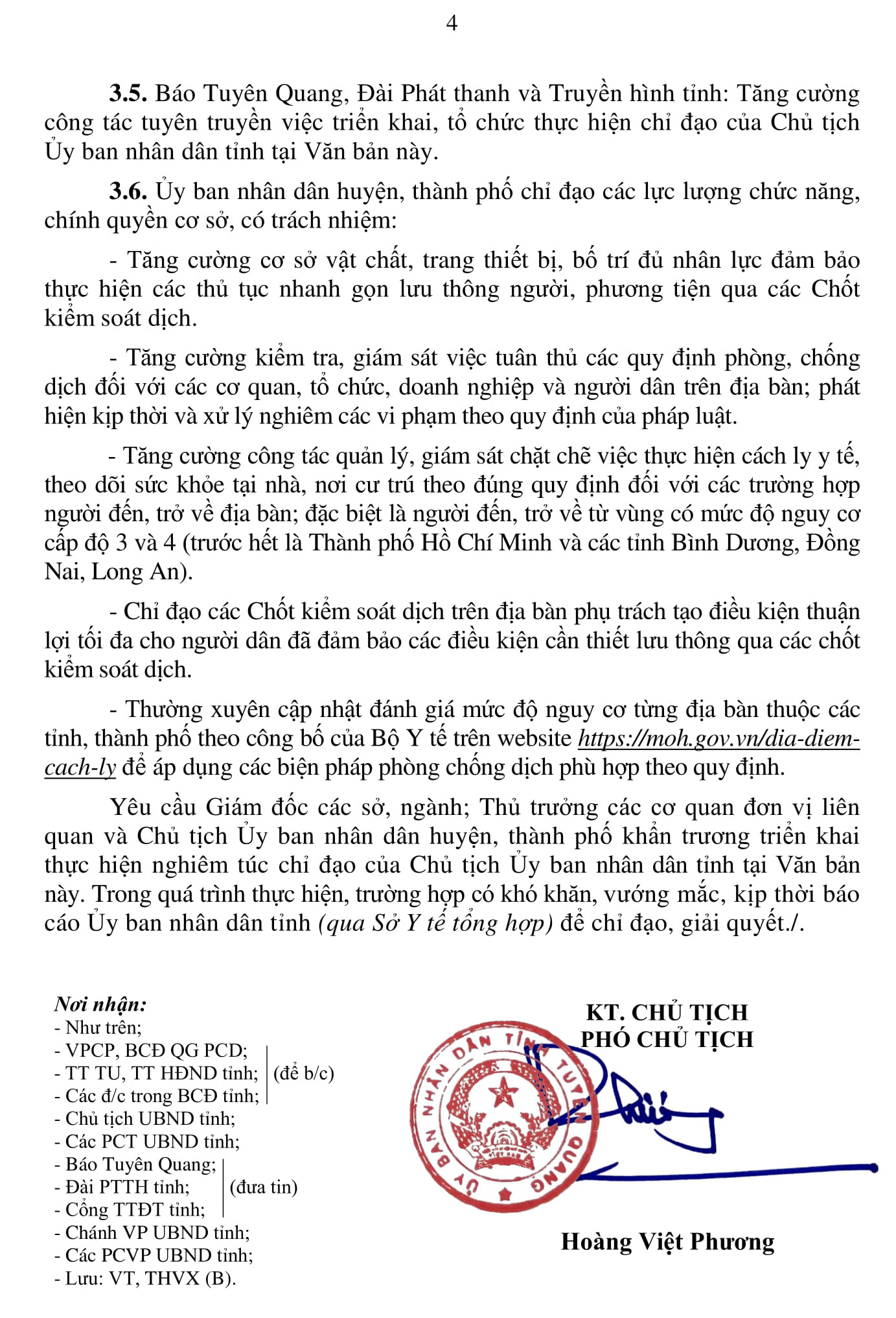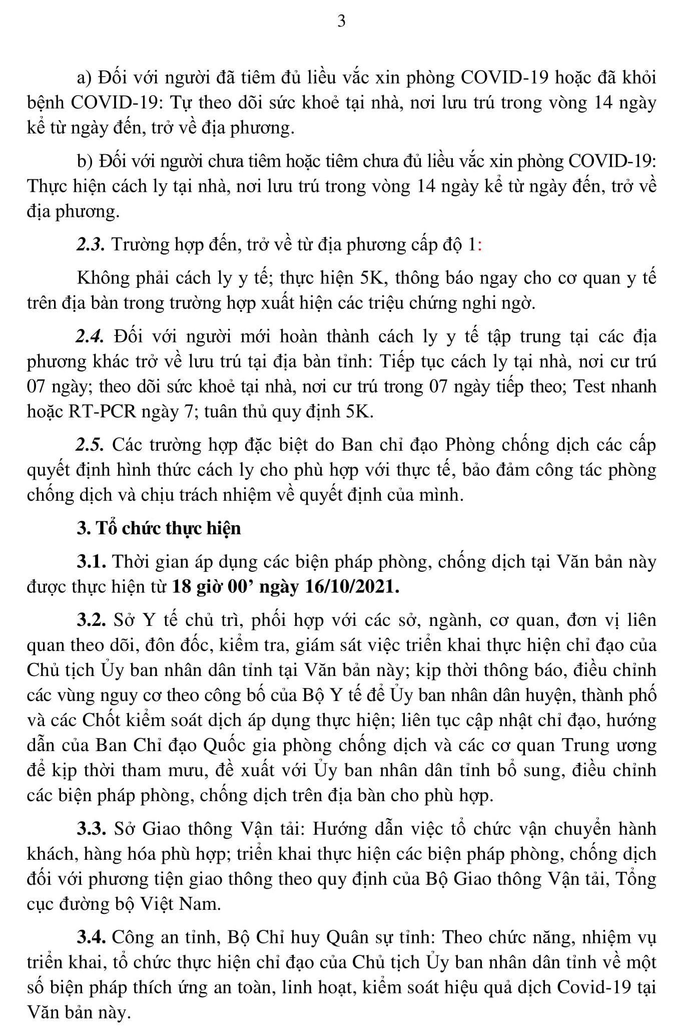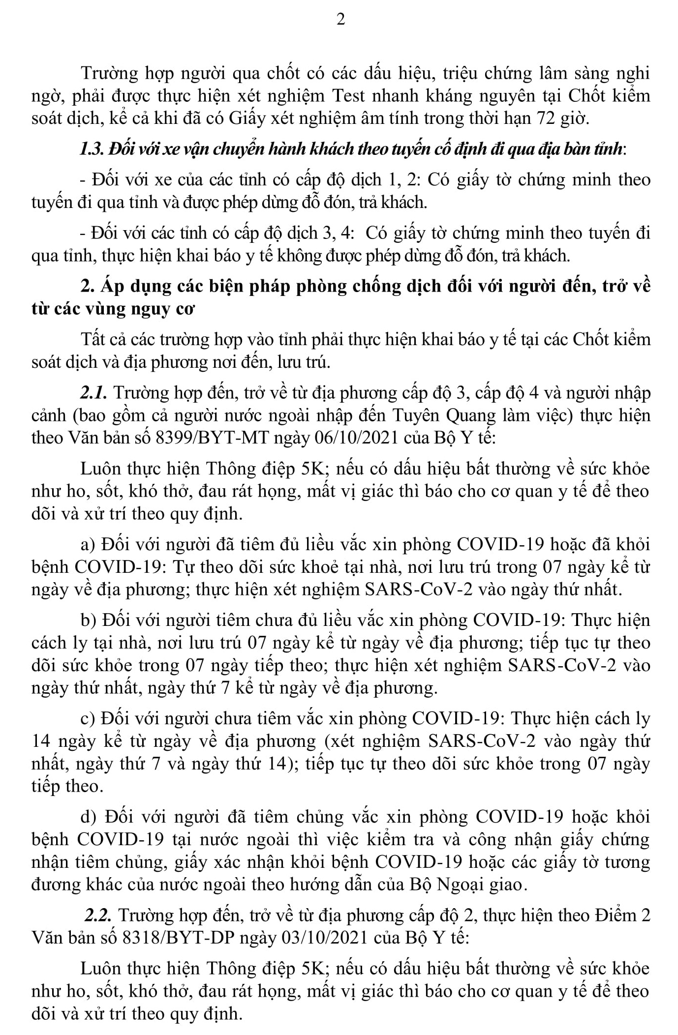 Văn bản cũng nêu rõ việc áp dụng các biện pháp phòng chống dịch đối với người đến, trở về từ các vùng nguy cơ. Trong đó, nhấn mạnh tất cả các trường hợp vào tỉnh phải thực hiện khai báo y tế tại các chốt kiểm soát dịch và địa phương nơi đến, lưu trú; tùy từng trường hợp đến, trở về từ địa phương theo các cấp độ 1, 2, 3, 4, người nhập cảnh, người mới hoàn thành cách ly y tế tập trung tại các địa phương khác và các trường hợp đặc biệt thì áp dụng các biện pháp cụ thể.