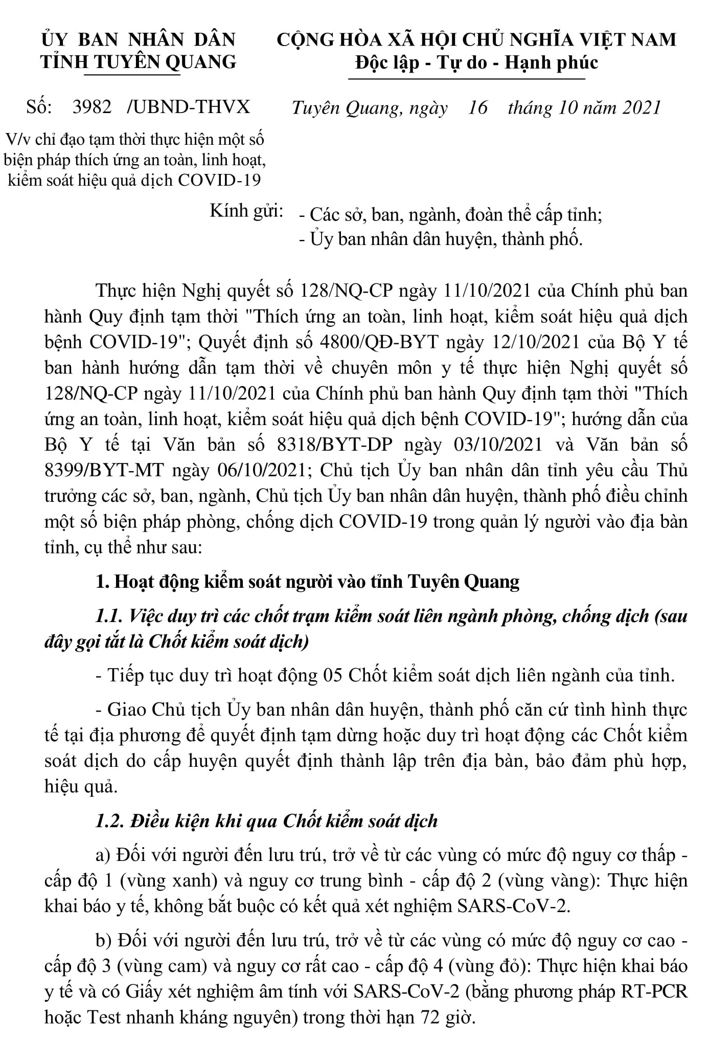 UBND tỉnh vừa ban hành văn bản số 3982/UBND-THVX, ngày 16/10/2021 về chỉ đạo tạm thời thực hiện một số biện pháp thích ứng an toàn, linh hoạt, kiểm soát có hiệu quả dịch Covid-19.