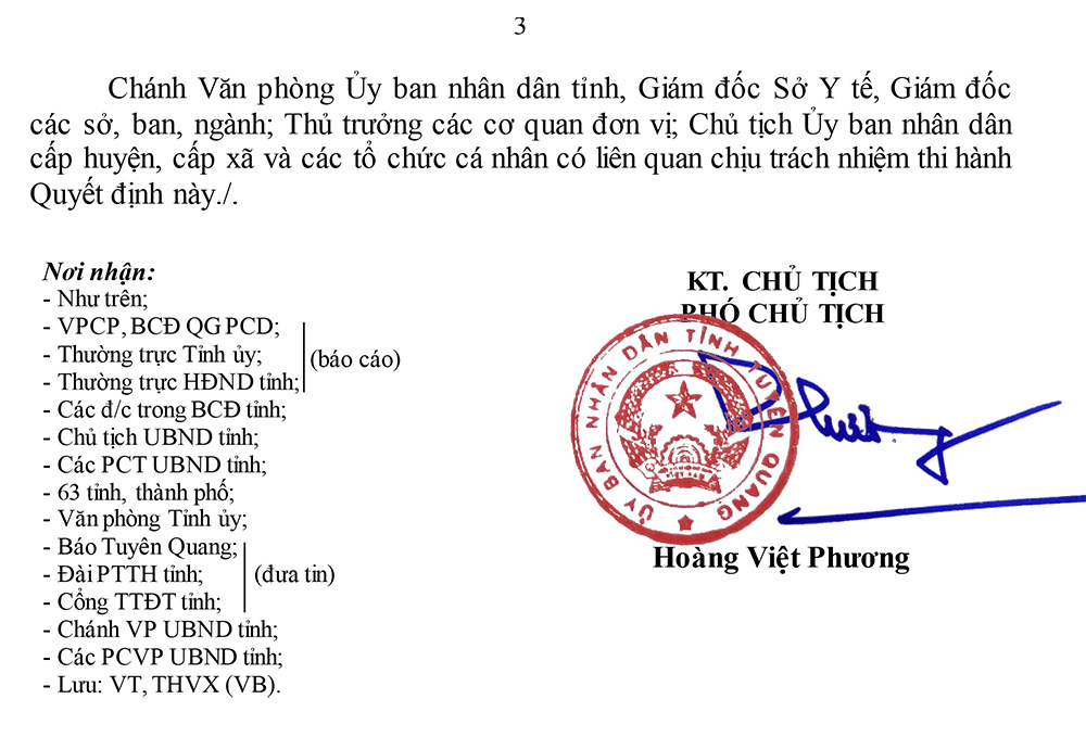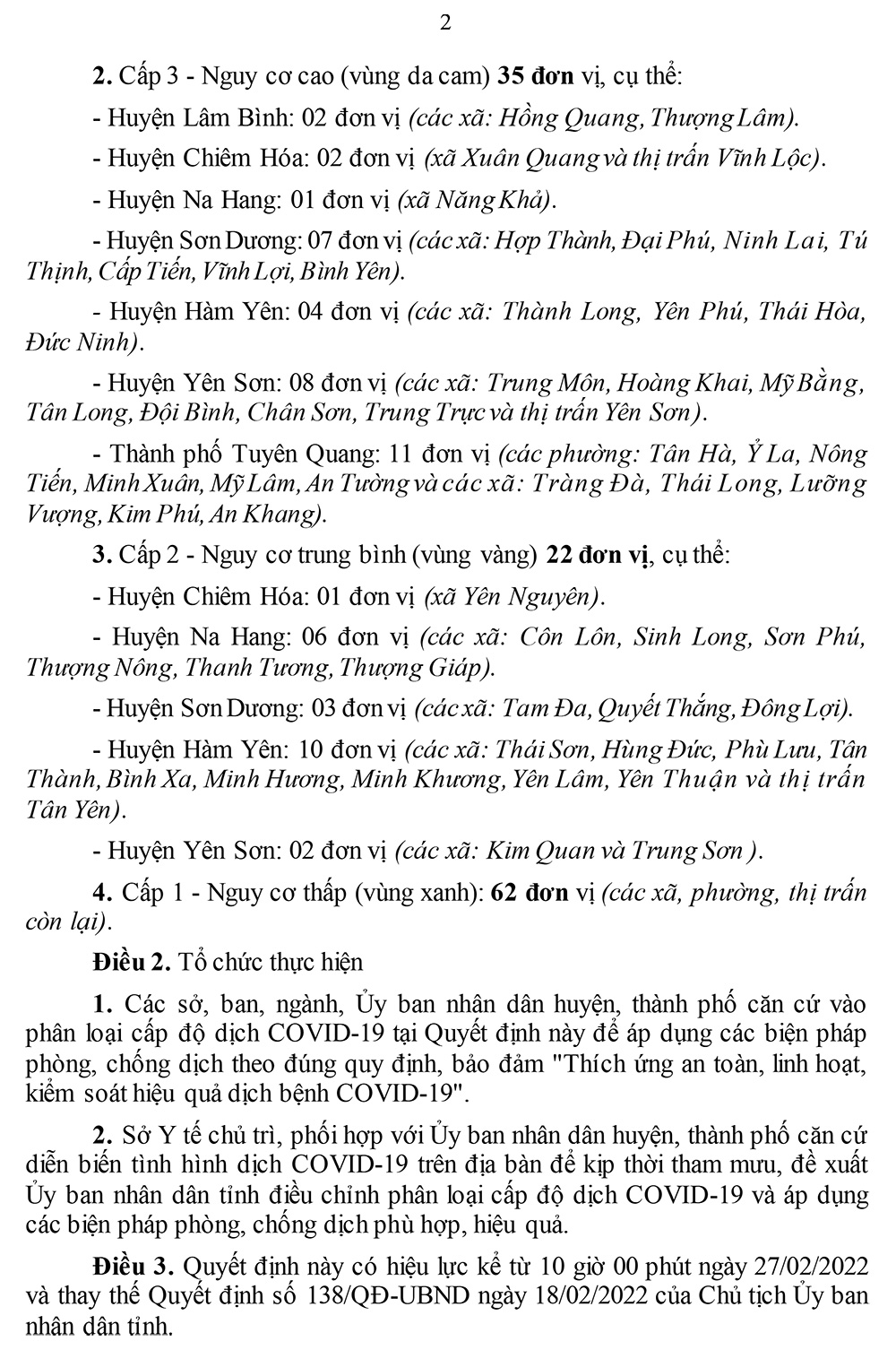 * Cấp độ 3 nguy cơ cao (vùng da cam) có 35 xã, phường, thị trấn là: Xã Hồng Quang, Thượng Lâm (Lâm Bình); xã Xuân Quang và thị trấn Vĩnh Lộc (Chiêm Hóa); xã Năng Khả (Na Hang); Hợp Thành, Ninh Lai, Đại Phú, Tú Thịnh, Cấp Tiến, Vĩnh Lợi, Bình Yên (Sơn Dương); Thành Long, Yên Phú, Thái Hòa, Đức Ninh (Hàm Yên); xã Trung Môn, Hoàng Khai, Mỹ Bằng, Tân Long, Đội Bình, Chân Sơn, Trung Trực và thị trấn Yên Sơn (Yên Sơn); phường Tân Hà, Ỷ La, Nông Tiến, Minh Xuân, Mỹ Lâm, An Tường và các xã Tràng Đà, Thái Long, Lưỡng Vượng, Kim Phú, An Khang (TP Tuyên Quang).