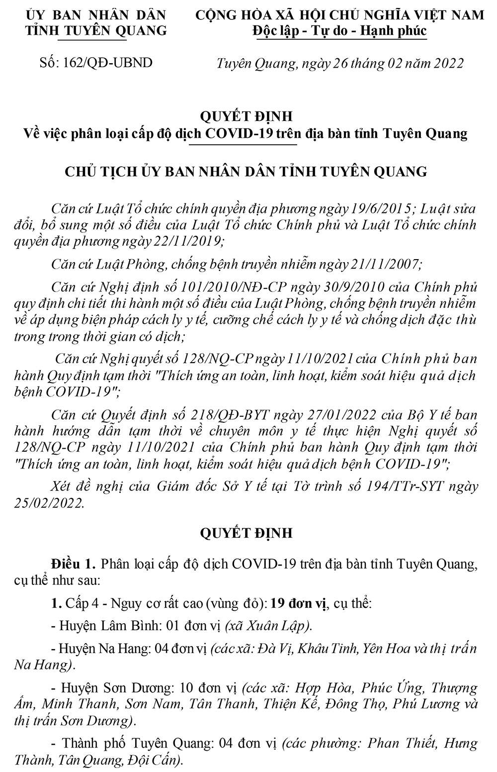 Ngày 26-2, UBND tỉnh đã ban hành Quyết định số 162/QĐ-UBND về việc phân loại cấp độ dịch Covid-19 trên địa bàn tỉnh.