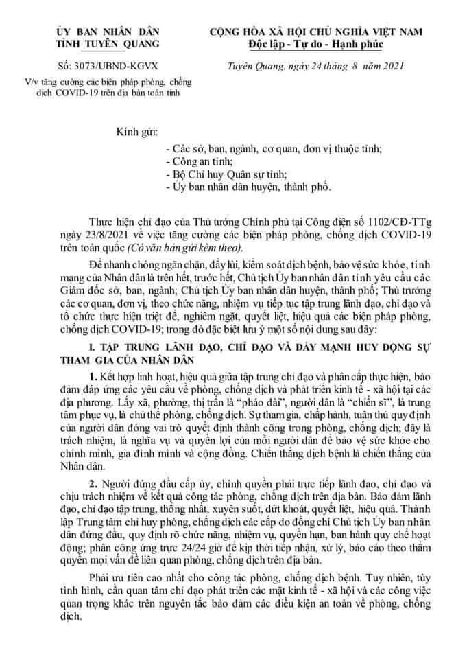 Nhằm nhanh chóng ngăn chặn, đẩy lùi, kiểm soát dịch bệnh, bảo vệ sức khỏe, tính mạng cho nhân dân, UBND tỉnh có văn bản số 3073/UBND-KGVX, ngày 24-8-2021 về việc tăng cường các biện pháp phòng, chống dịch Covid-19 trên địa bàn toàn tỉnh.