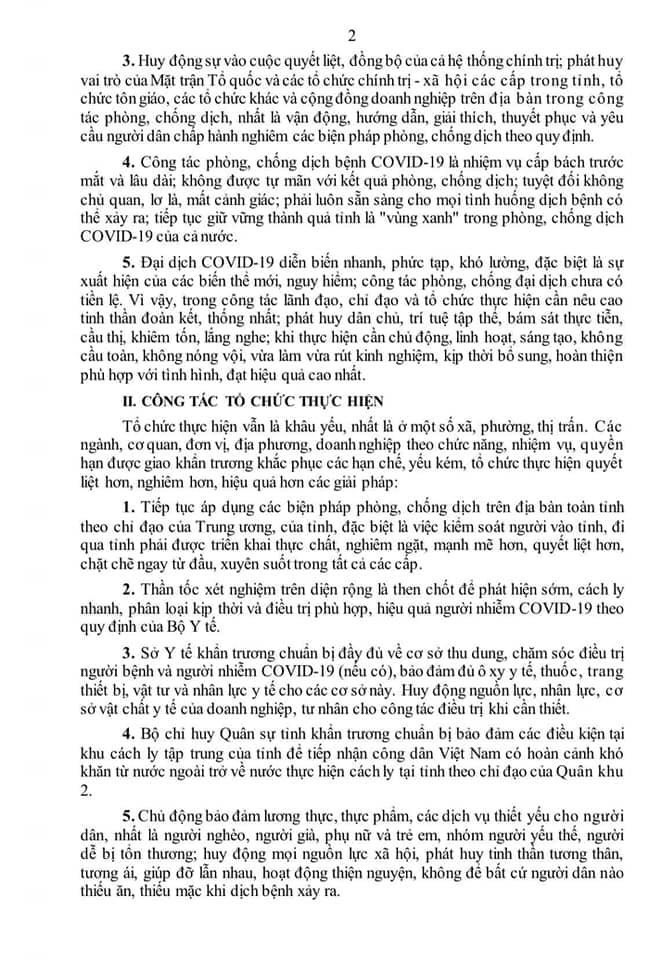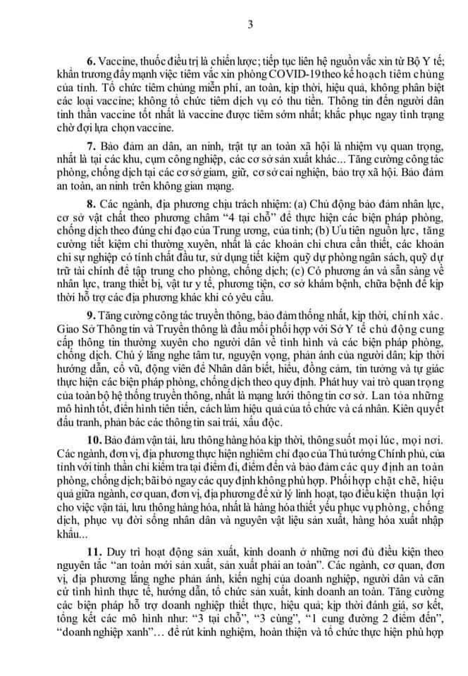Tổ chức thực hiện quyết liệt hơn, hiệu quả hơn các giải pháp: Tiếp tục áp dụng các biện pháp phòng, chống dịch trên địa bàn tỉnh, đặc biệt là việc kiểm soát người vào, đi qua tỉnh; thần tốc xét nghiệm trên diện rộng là then chốt; chủ động đảm bảo lương thực, thực phẩm, các dịch vụ thiết yếu cho người dân; bảo đảm an ninh, trật tự an toàn xã hội; Duy trì hoạt động sản xuất kinh doanh ở những nơi đủ điều kiện theo nguyên tắc “an toàn mới sản xuất, sản xuất phải an toàn”; đảm bảo các điều kiện tại các khu cách ly tập trung, chăm sóc, điều trị người bệnh và người nhiễm Covid-19 (nếu có); tổ chức tiêm chủng vacxin miễn phí, an toàn, hiệu quả.