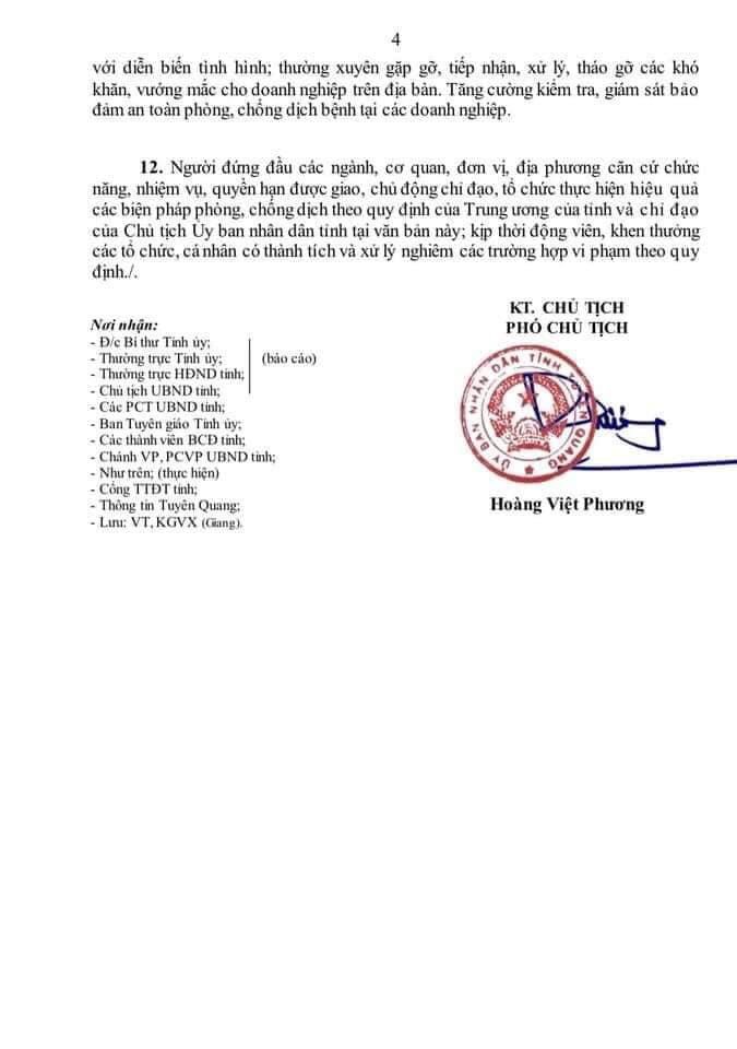 Theo đó, Chủ tịch UBND tỉnh yêu cầu các giám đốc sở, ban, ngành; chủ tịch UBND huyện, thành phố; thủ trưởng các cơ quan đơn vị theo chức năng, nhiệm vụ tiếp tục tập trung lãnh đạo, chỉ đạo và tổ chức thực hiện triệt để, nghiêm ngặt, quyết liệt, hiệu quả các biện pháp phòng, chống dịch Covid-19. Trong đó, đặc biệt lưu ý: