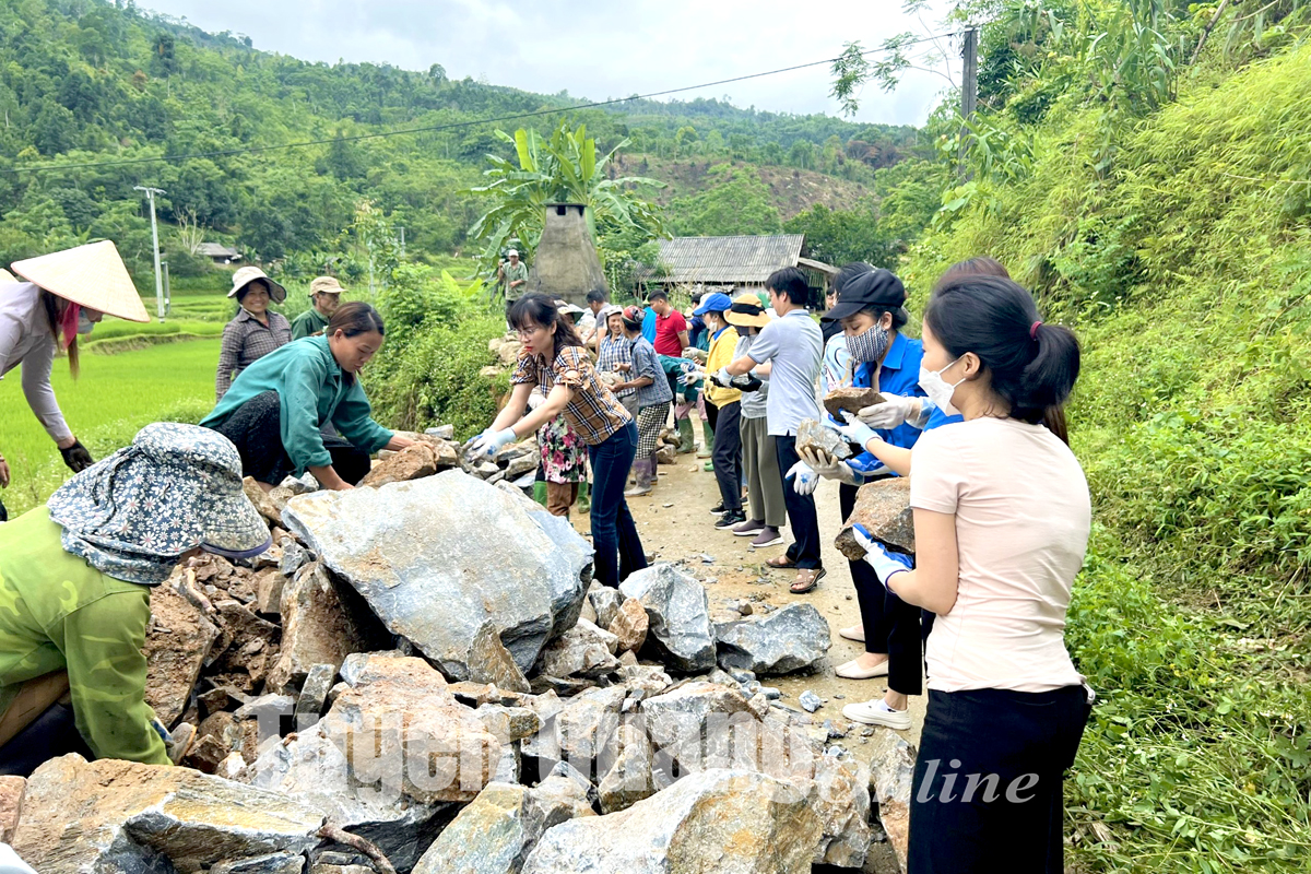 thôn Nà Sảm vận chuyển đá để làm kè đường.