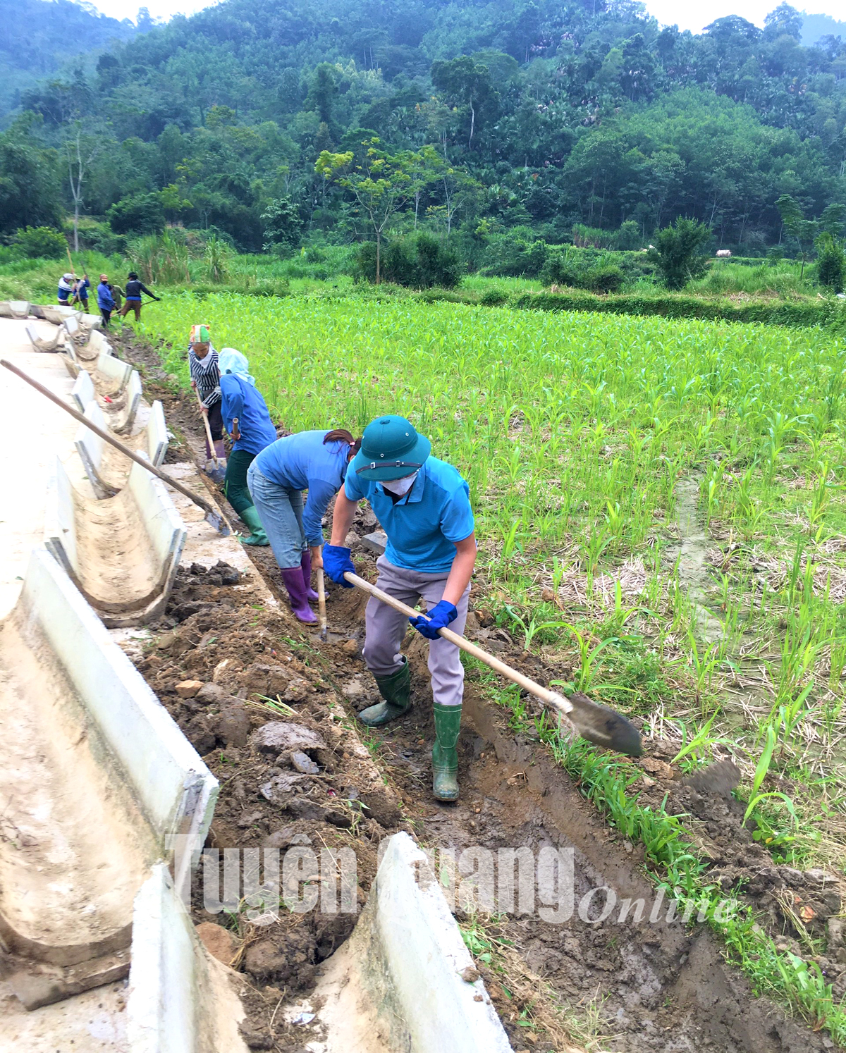 Cán bộ, đảng viên chi bộ 8, Đảng bộ Cục Thuế tỉnh cùng nhân dân thôn làng Thẳm nạo vét kênh mương để lắp đặt cấu kiện.