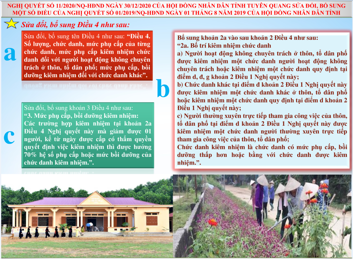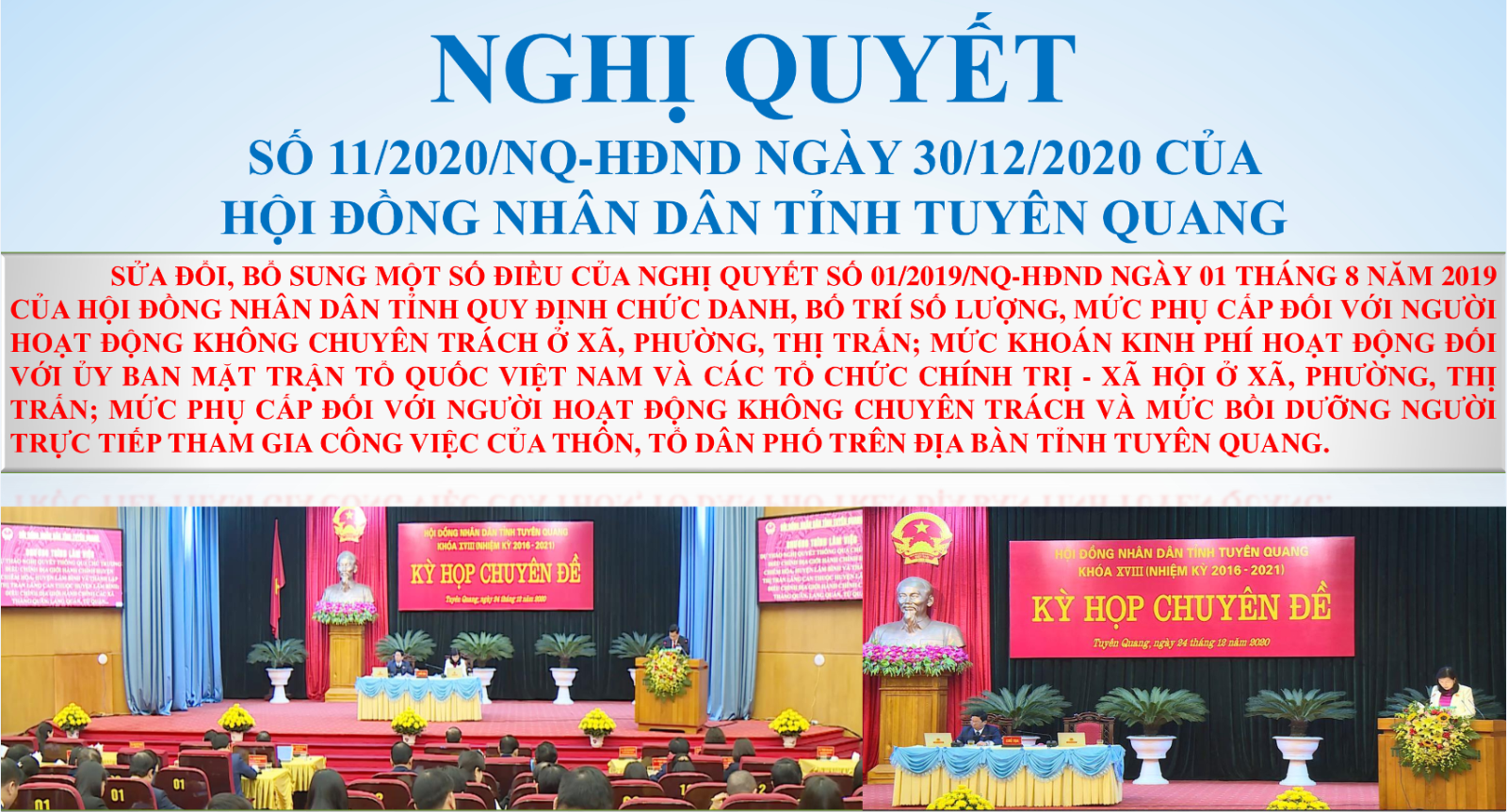 Tại kỳ họp chuyên đề ngày 24/12/2020, Hội đồng nhân dân tỉnh đã thông qua Nghị quyết Sửa đổi, bổ sung một số điều của Nghị quyết số 01/2019/NQ-HĐND ngày 01/8/2019 của HĐND tỉnh quy định chức danh, bố trí số lượng, mức phụ cấp đối với người hoạt động không chuyên trách ở xã, phường, thị trấn; mức khoán kinh phí hoạt động đối với Ủy ban Mặt trận Tổ quốc Việt Nam và các tổ chức chính trị - xã hội ở xã, phường, thị trấn; mức phụ cấp đối với người hoạt động không chuyên trách và mức bồi dưỡng người trực tiếp tham gia công việc của thôn, tổ dân phố trên địa bàn tỉnh Tuyên Quang.