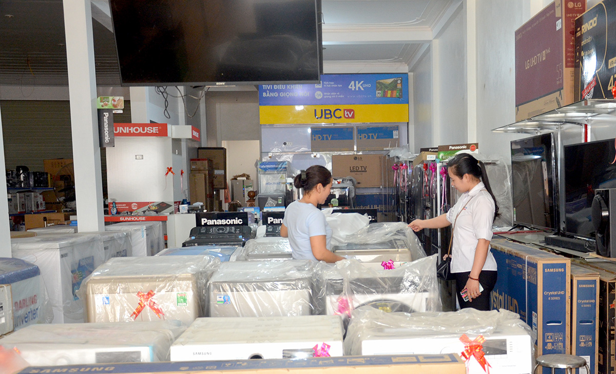 Khách hàng lựa chọn mua hàng tại cửa hàng kinh doanh điện máy của gia đình anh Kim Văn Tâm,