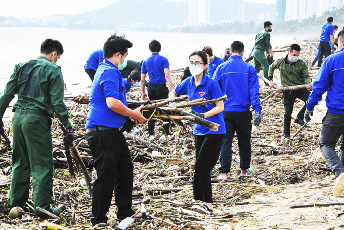 Đoàn viên thanh niên tham gia dọn dẹp vệ sinh môi trường biển sau đợt mưa lớn kéo dài. (Ảnh: Doanthanhnien.vn)