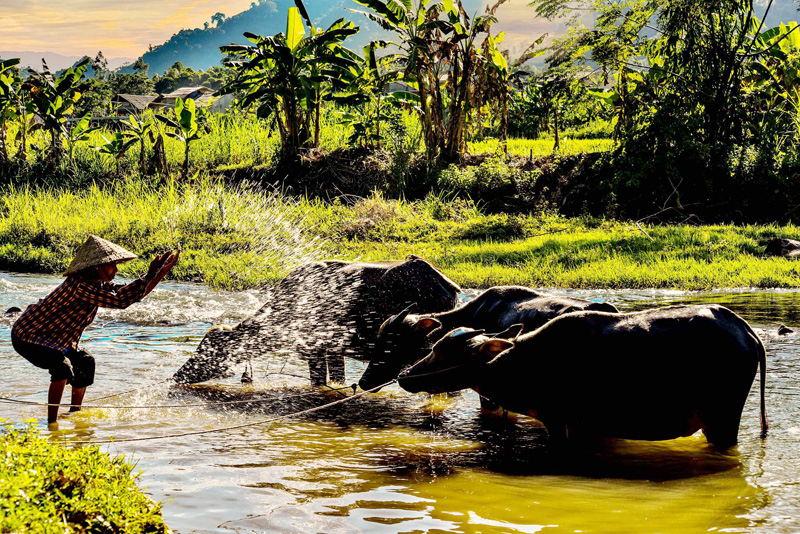râu không chịu được khí hậu quá lạnh hay quá nóng, việc tắm mát cho trâu