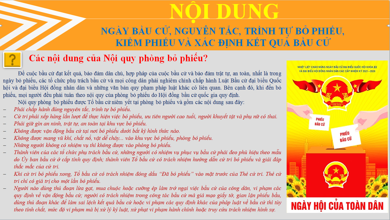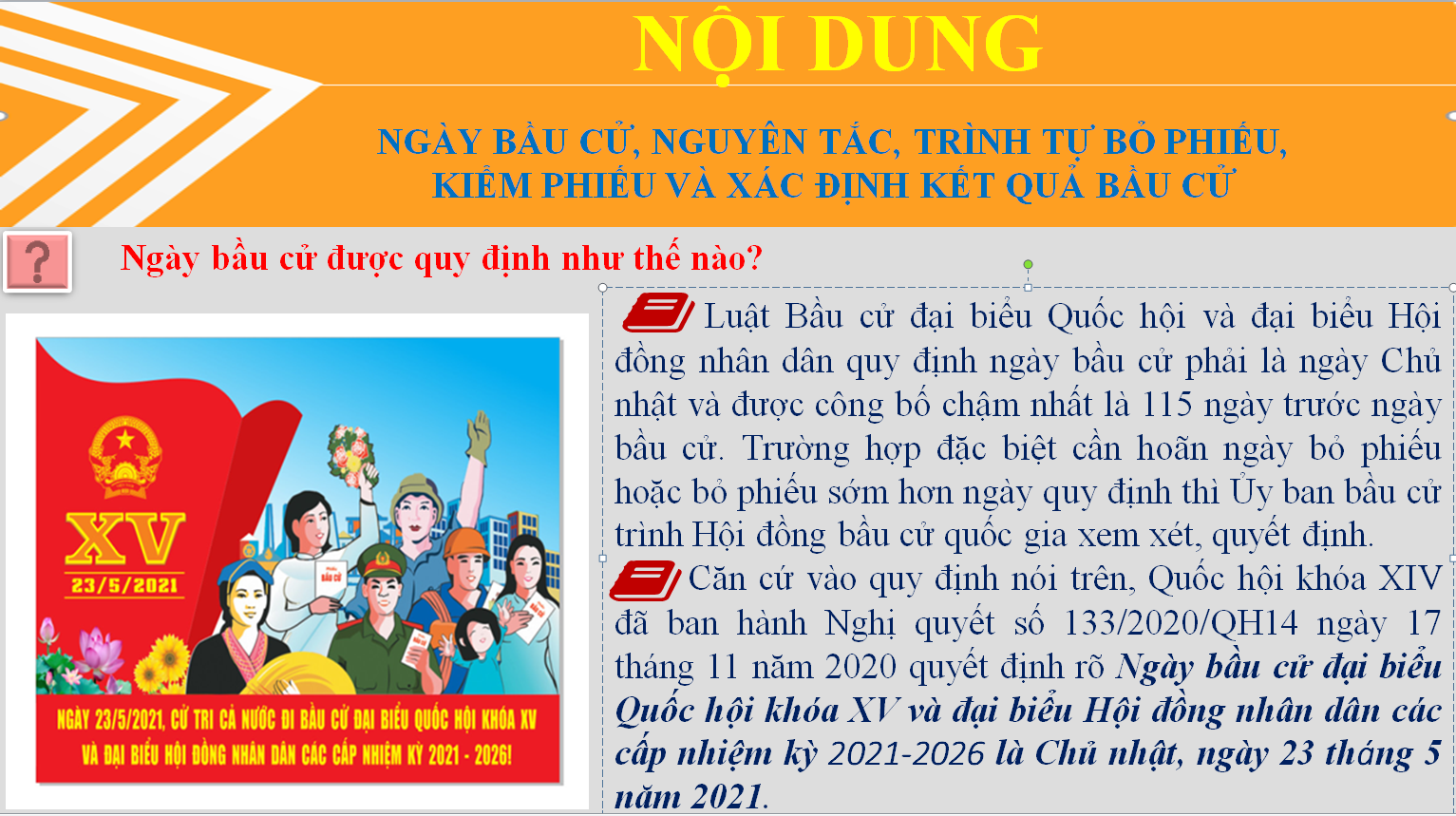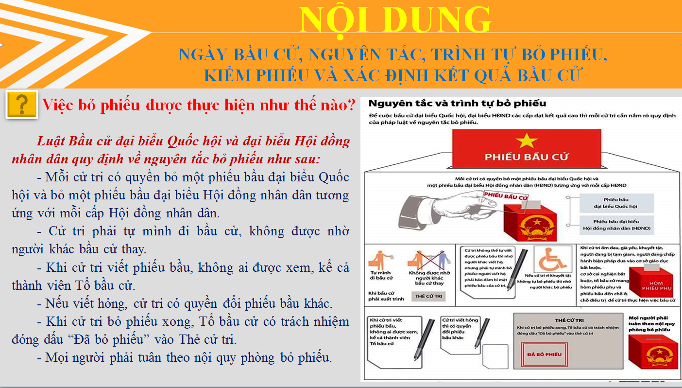 Ngày bầu cử đại biểu Quốc hội khóa XV và đại biểu HĐND các cấp nhiệm kỳ 2021 - 2026 được ấn định là Chủ nhật ngày 23 tháng 5 năm 2021. Đến nay, công tác chuẩn bị cho cuộc bầu cử trên địa bàn tỉnh Tuyên Quang đã được triển khai thực hiện theo đúng yêu cầu quy định và tiến độ đề ra, sẵn sàng cho cuộc bầu cử diễn ra thật sự dân chủ, bình đẳng, đúng pháp luật, an toàn và tiết kiệm. Để tiếp tục phục vụ các tổ chức phụ trách bầu cử, cơ quan, tổ chức, đơn vị và cử tri nghiên cứu, tìm hiểu và thực hiện những nội dung của pháp luật về bầu cử đại biểu Quốc hội khóa XV và đại biểu Hội đồng nhân dân các cấp nhiệm kỳ 2021-2026. Ban Biên tập trân trọng giới thiệu nội dung tuyên truyền về Ngày bầu cử, nguyên tắc, trình tự bỏ phiếu, kiểm phiếu và xác định kết quả bầu cử.